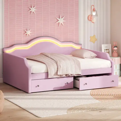 This excellent upholstered daybed is the perfect platform to hold your standard size mattress and eliminates the need for a box spring.The whole construction is made of velvet, solid wood and MDF so it has a long service time.Pink or beige curved backrest with LED, it will make the daybed the focal point of the room.