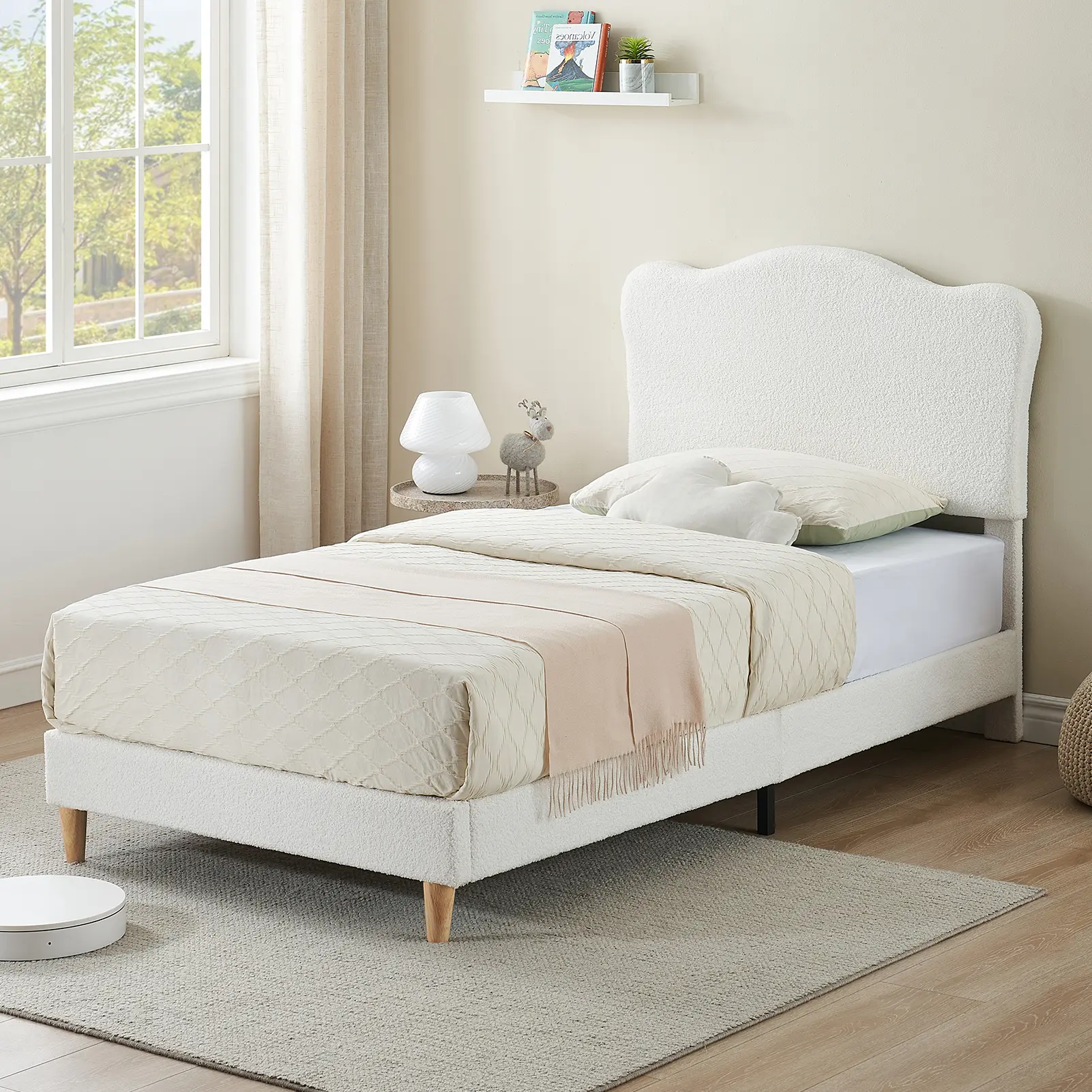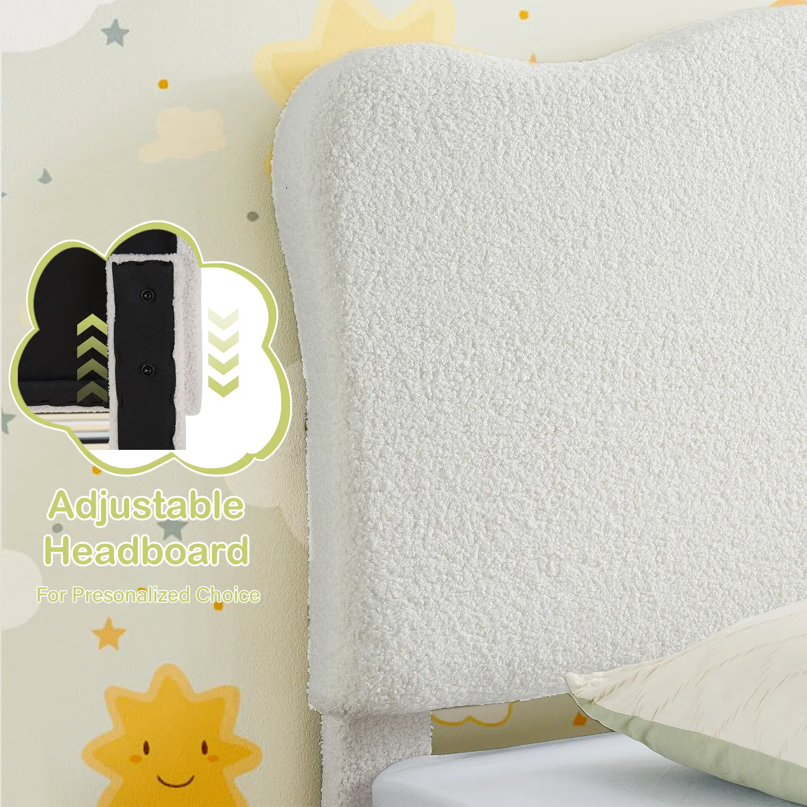 ·1.Charming Crown Headboard: Features a whimsical crown or scalloped headboard design with soft, high-density foam padding, creating a cozy and magical focal point for any child's or teen's bedroom.