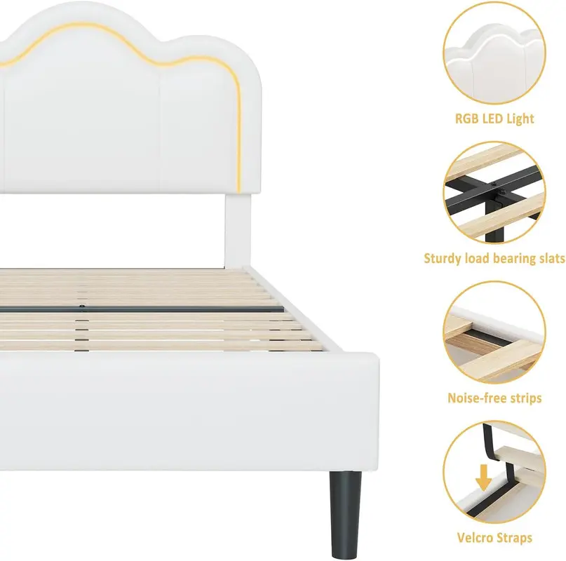The Multi-Function RGB LED Bed is an upholstered frame featuring smart LED light strips with over 16 million colors and 20+ effects, easily controlled via a mobile app or remote to create a captivating ambiance and serve as a night light. With an off-white hue, the modern faux leather hill-shaped headboard is adjustable from 44" to 46", making it perfect for 10" to 12" mattresses while adding warmth and style to any bedroom. The twin bed's high-leg design (6.5") offers ample under-bed storage and easy access for robotic vacuums, effectively maximizing space and keeping your room organized. Built with a sturdy metal frame and wooden slat support, it accommodates up to 750 lbs, while mute bars minimize noise for a peaceful night's sleep. Assembly is a breeze, as the bed comes with all necessary parts, a detailed manual, and tools, allowing one person to complete it in about 40 minutes for a hassle-free DIY experience.