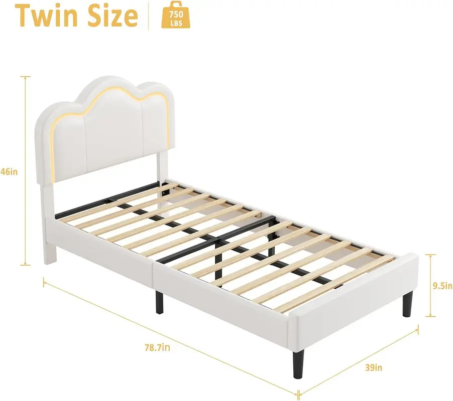 5. Twin Upholstered Smart LED Bed Frame with Adjustable Hills Headboard, PU Leather Platform Bed Frame for Kids, Wooden Slats Support, No Box Spring Needed, Easy Assembly, White