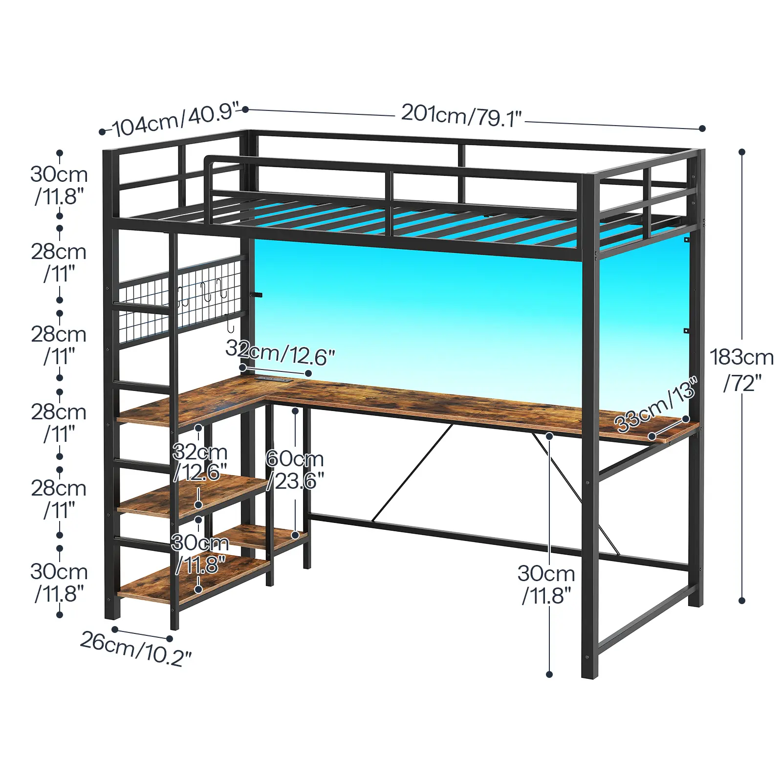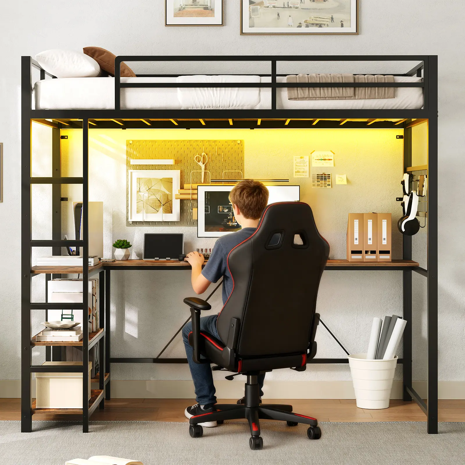 ·App & Remote Controlled RGB LED Lights: This loft bed has a multi-color light strip, allowing you to create a vibrant atmosphere with the remote or your smartphone app. Easily control 8 modes, 21 colors, and 8 brightness levels for a customized look