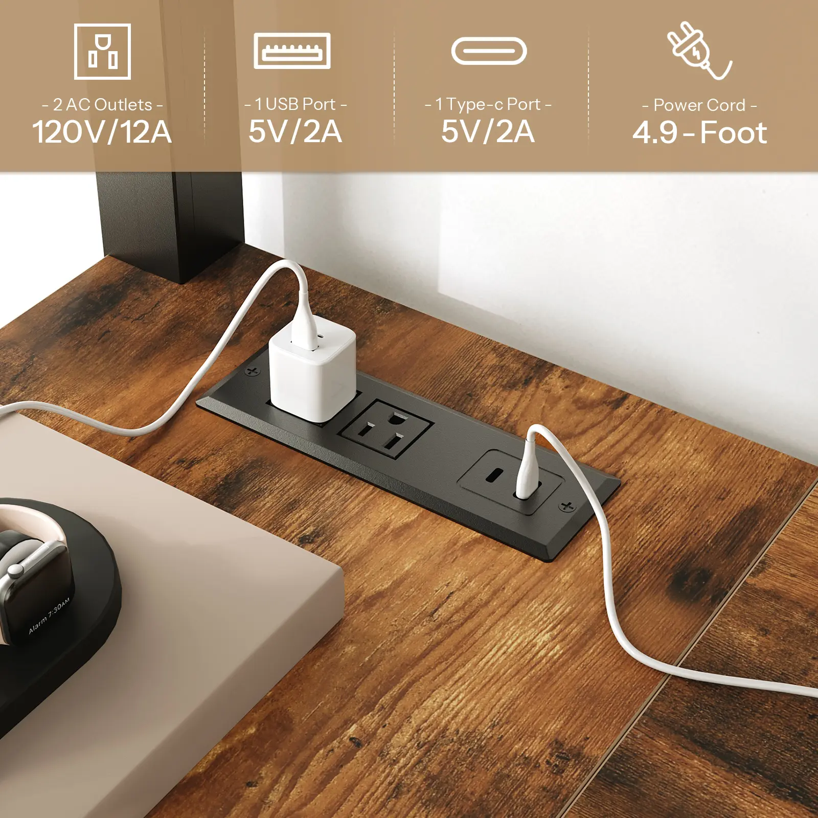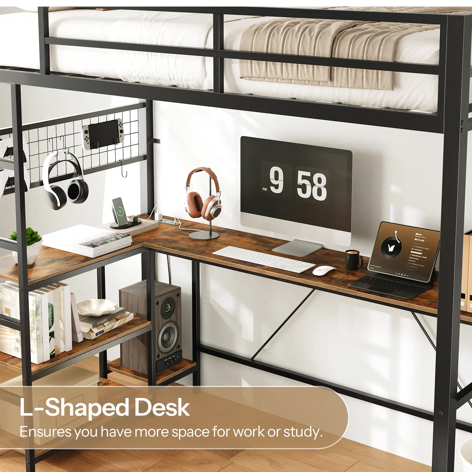 ·Built-in L-Shaped Desk with Charging Station: This bed with desk features an integrated L-shaped desk with a built-in charging hub (2AC + 1USB + 1Type-C), offering ample space for study or work and keeping your devices powered within easy reach