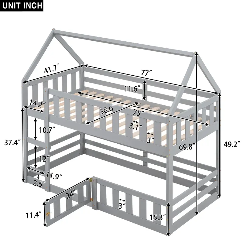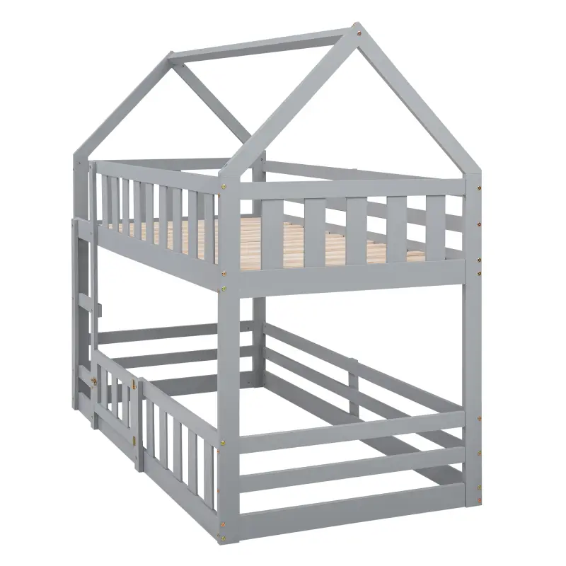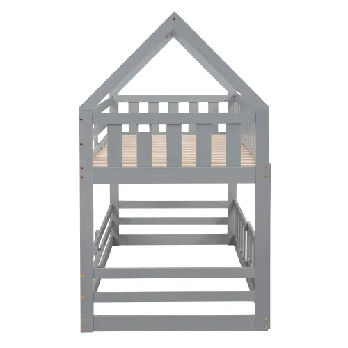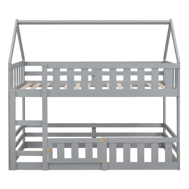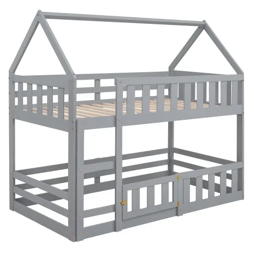 Twin over Twin House Bunk Bed with Fence and Door, Gray