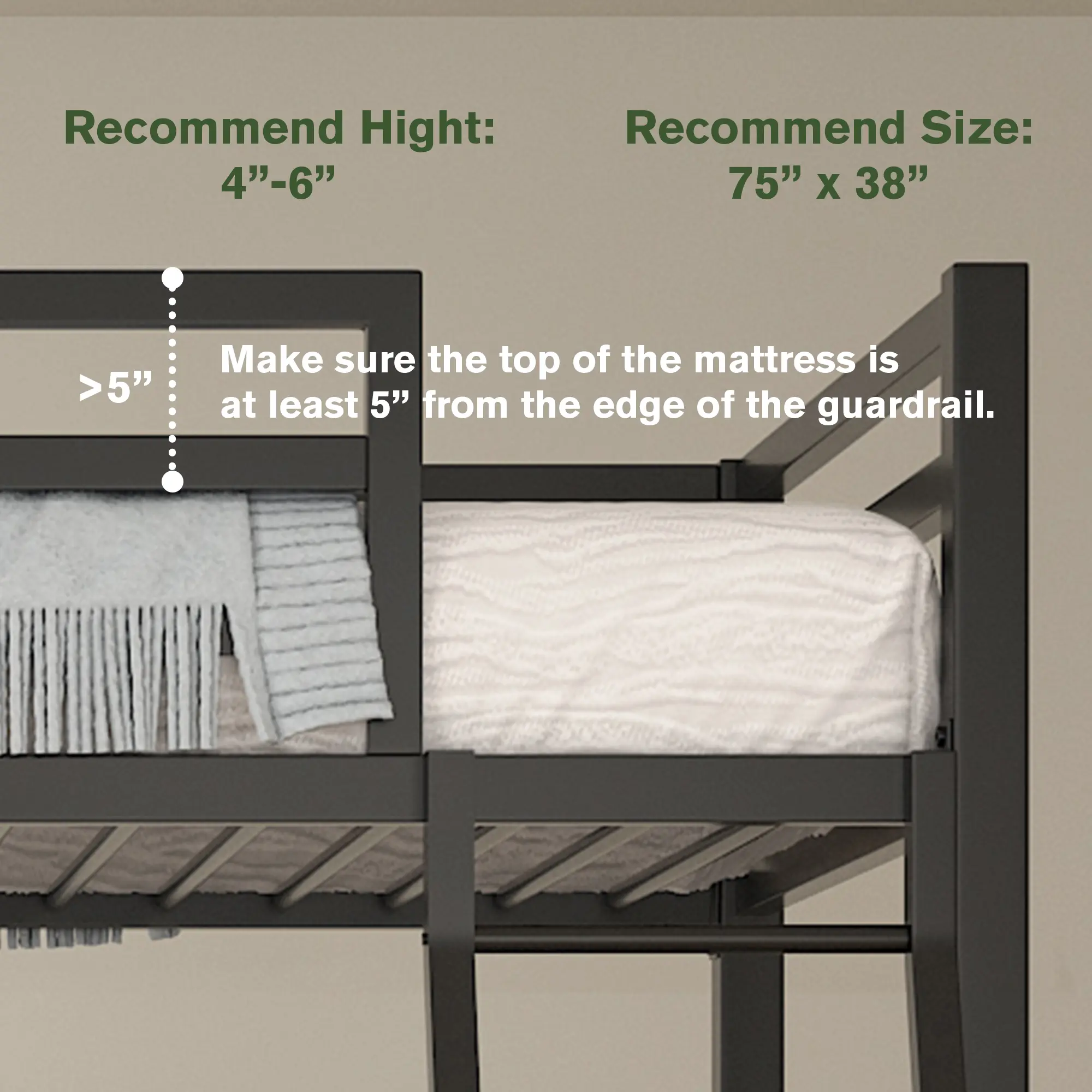 ·Note: For your safety, the mattress on the upper bed must be at least 5 inches (127 mm) below the top edge of the guard rail.