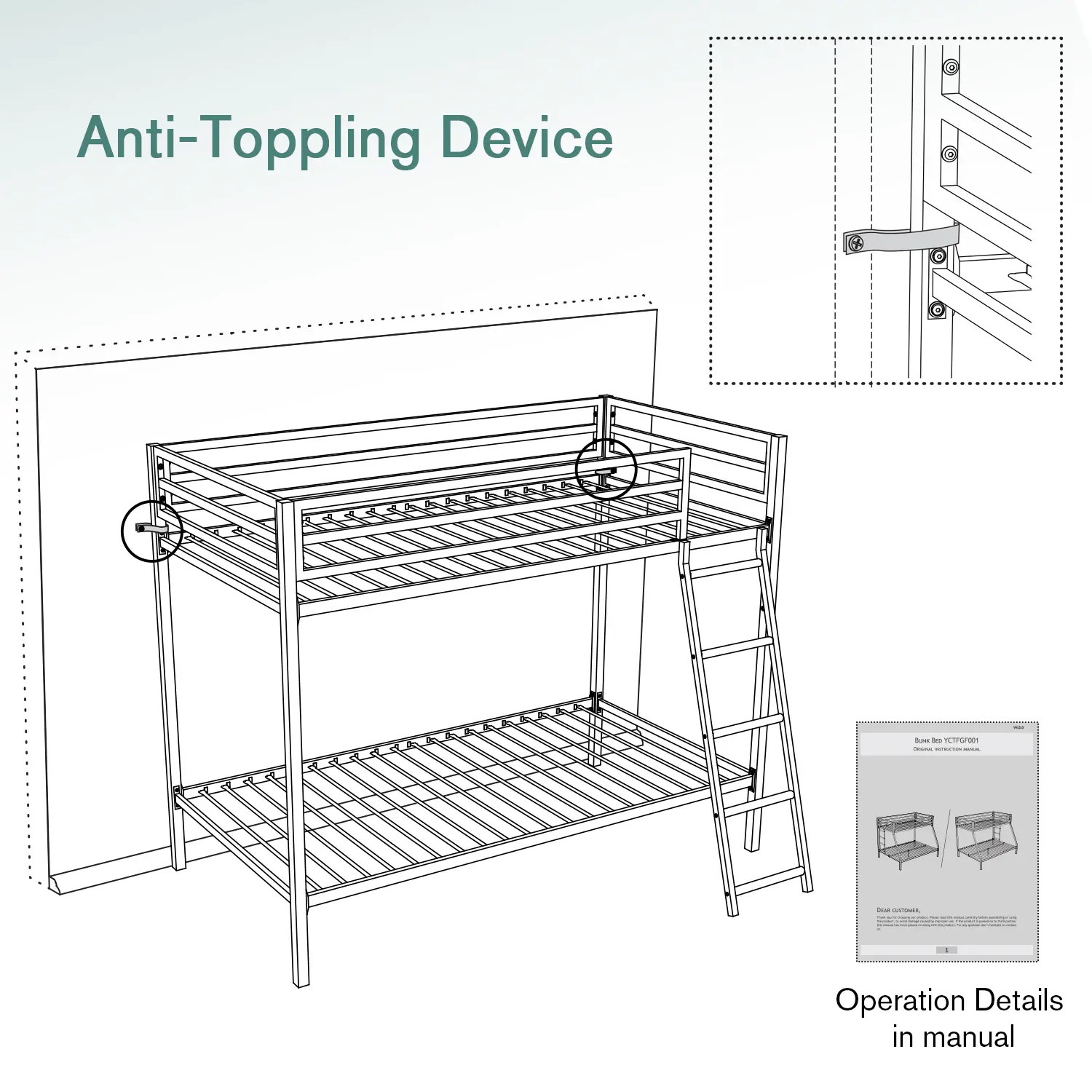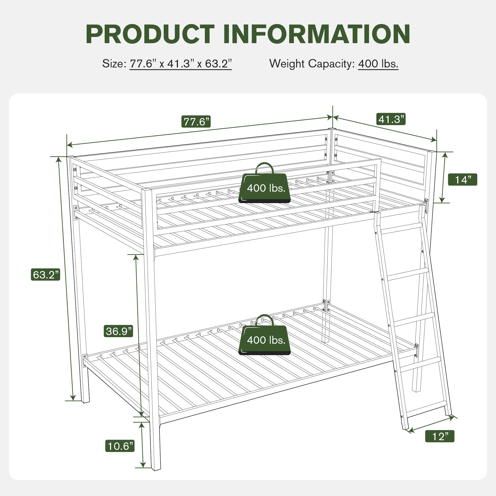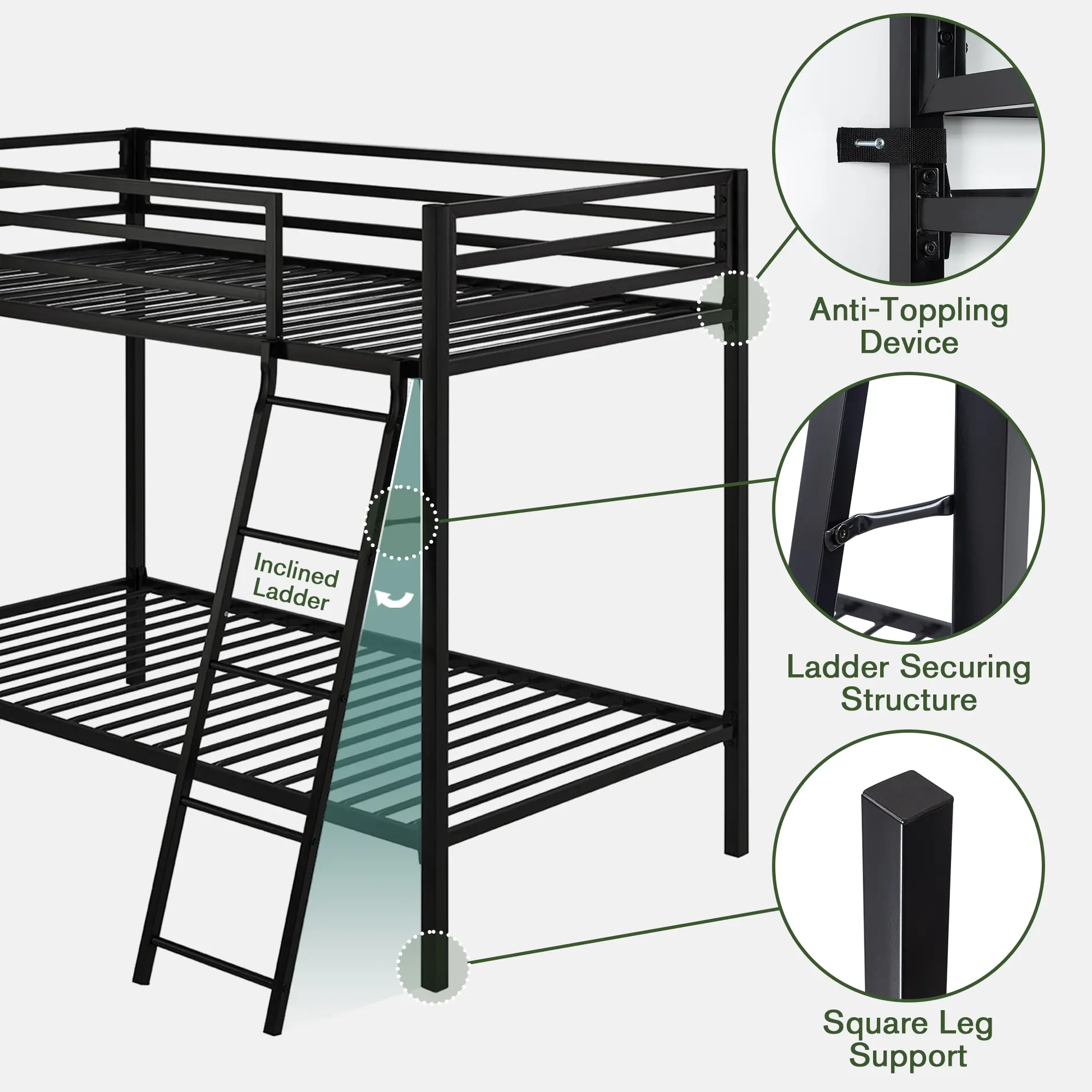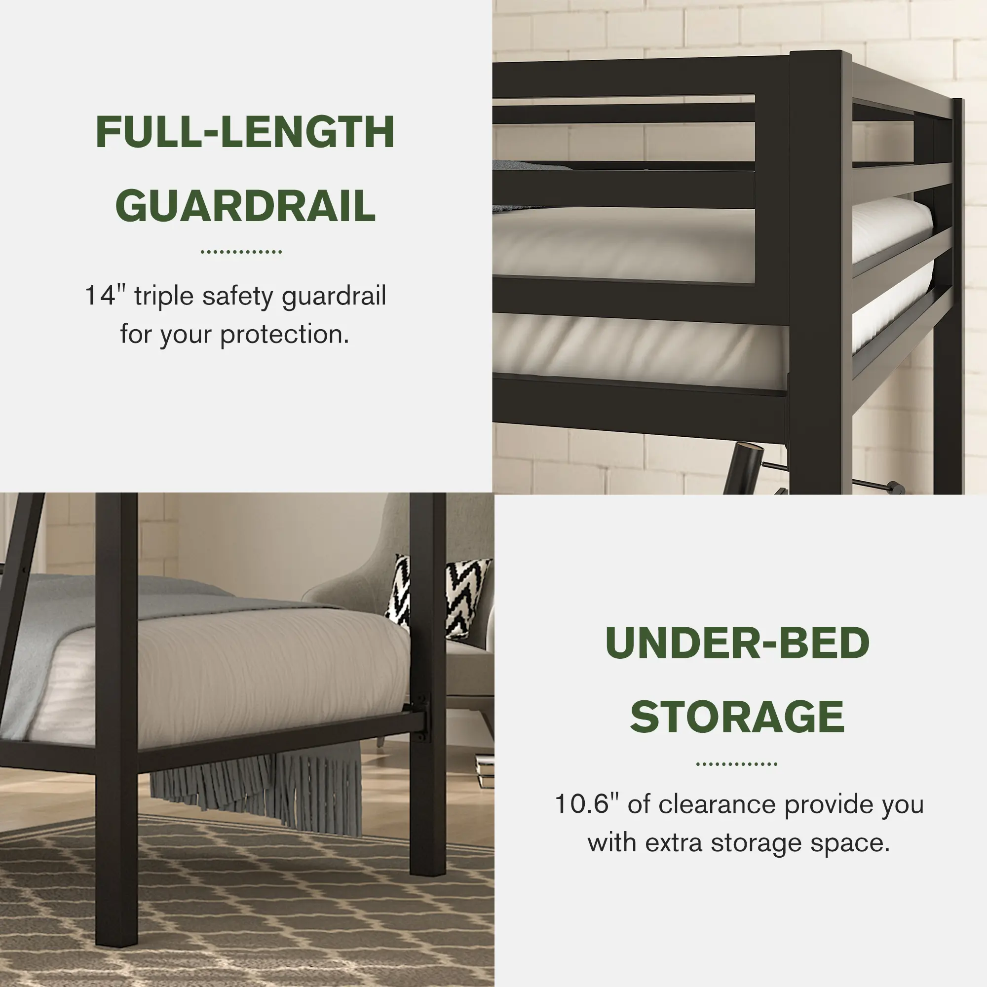 ·Safety Structure: All 4 sides on the top are fully enclosed, using a 14” thick iron guardrail to prevent falling. The average force of 20 slats makes each layer load up to 400lbs. , equivalent to the weight of four 15-year-old children.