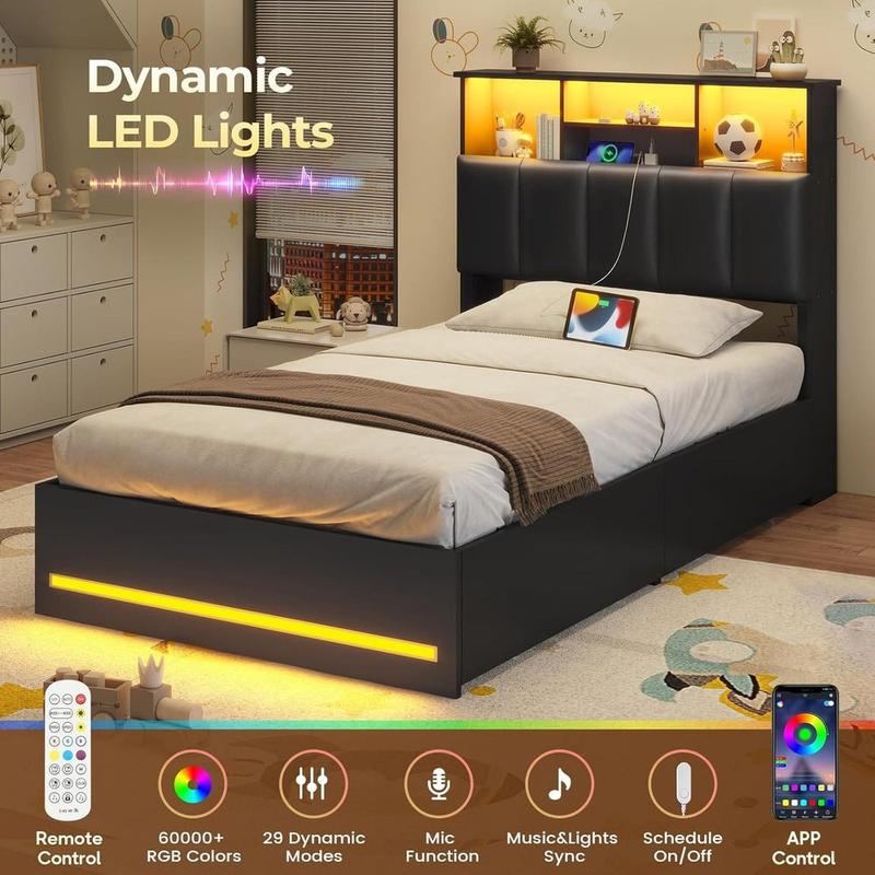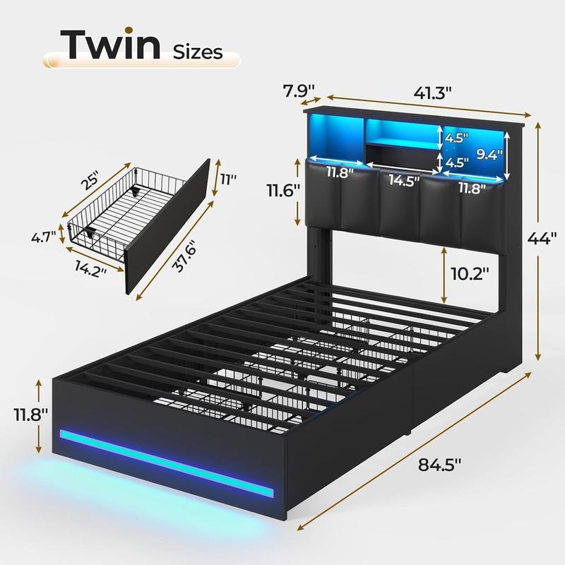 Twin Bed Frames with Storage Headboard&Drawers, Charging Station and LED Lights