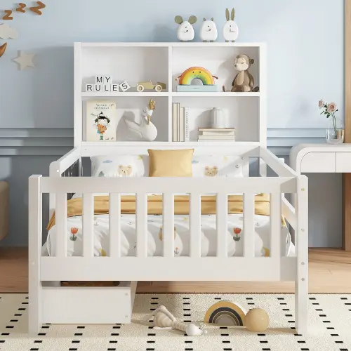 ·【Smart Storage with Drawers & Shelves】Designed with built-in drawers and open shelves, this solid wood bed keeps toys, books, and clothes neatly organized. The storage is integrated under and beside the bed, saving space while maintaining a clean, clutter-free bedroom.