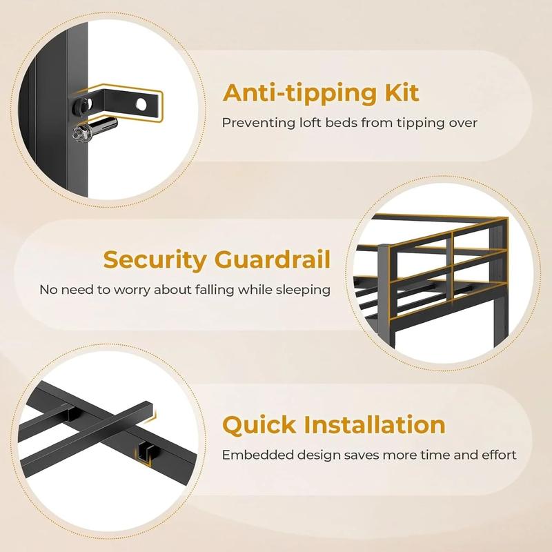 13.1" upper guardrail height with premium metal frame for secure children's safety. Conveniently ladder of this loft bed twin size providing an easy and safe access to the bed.Anti-tipping device also enhanced safety. No-slip pads preventing sliding and protect your floor.