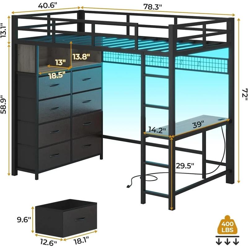 Multi-fuctional loft bed with smart led lights, easily control with remote or APP, comes with various color options and flsahing options, offers a nice ambiance for your bedroom, brighting up your nignt.
