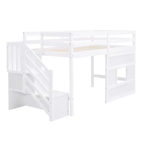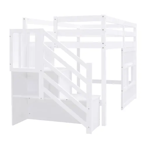 【Bellemave】Twin Size Loft Bed with Storage Staircase and Window, With LED Light, White