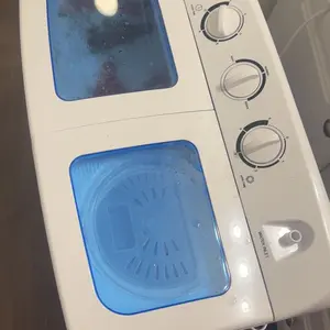 Es chiquito y funciona bien pero le tienes que llenar de agua y drenarlo como 5 veces para que se le quite todo el jabón a la ropa, y si hace ruido y más cuando los exprime. Le caben dos toallas medianas y tres jeans