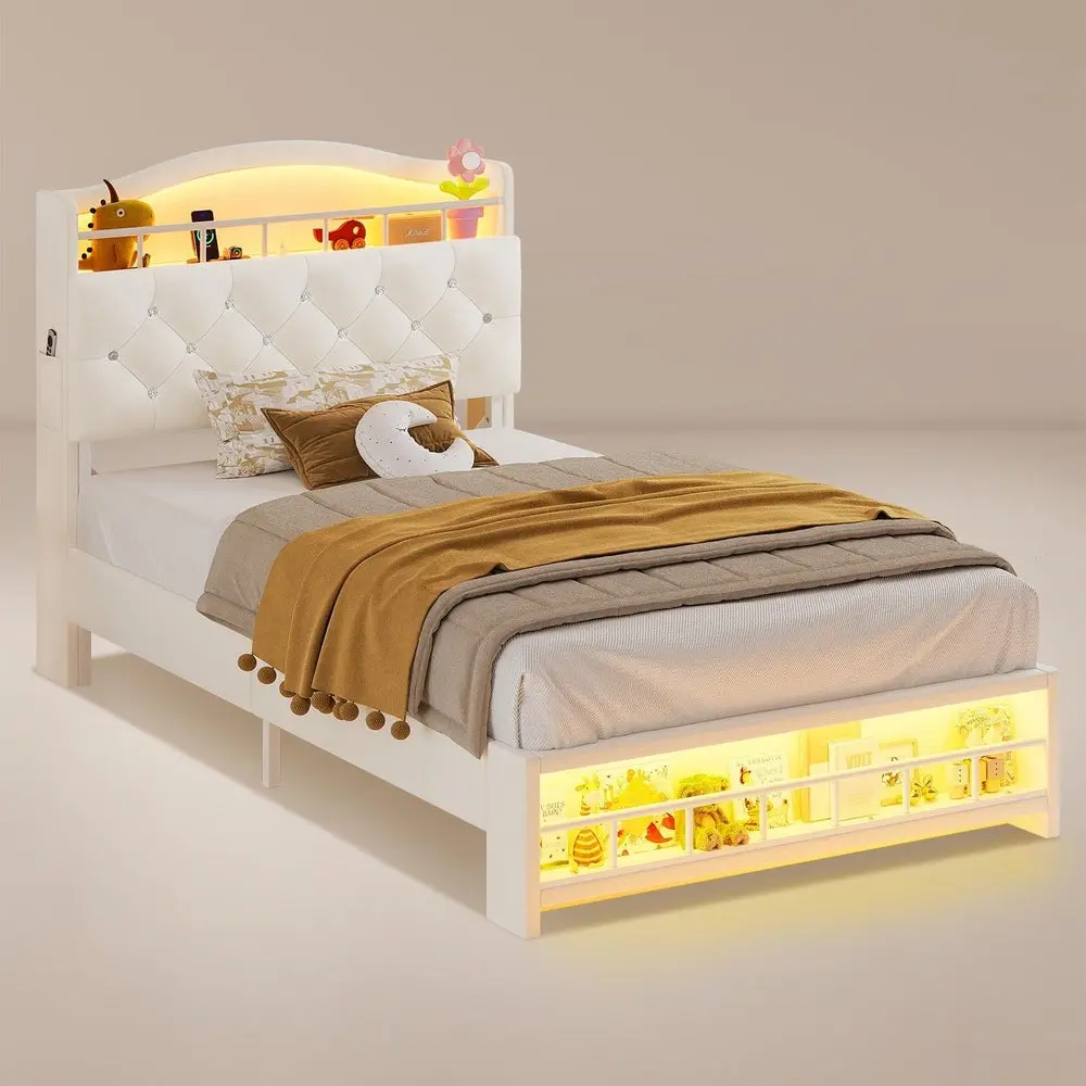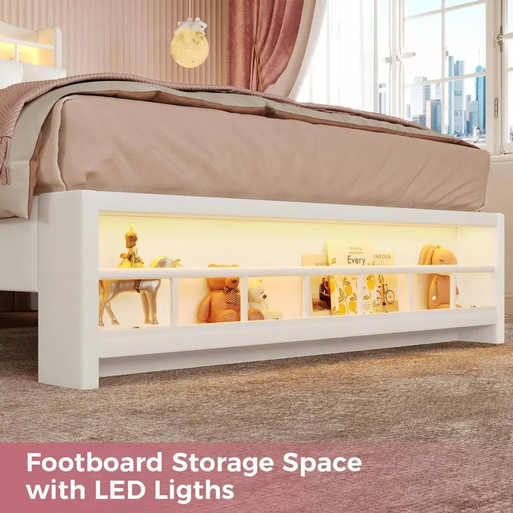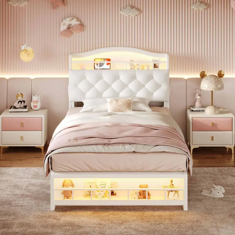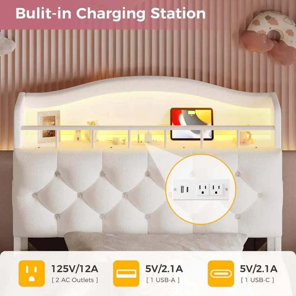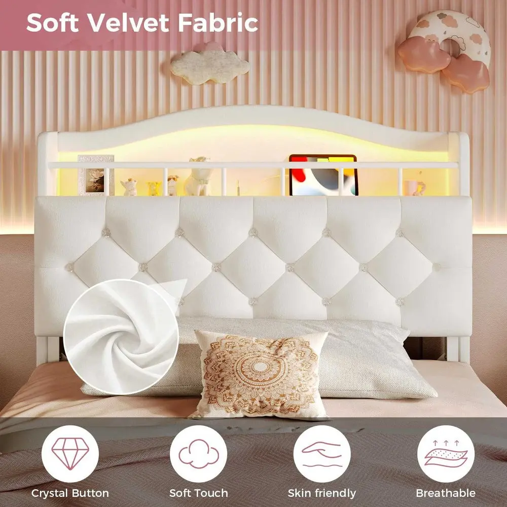 Girls Bed Storage Headboard with LED Lights & Charging Station Beige