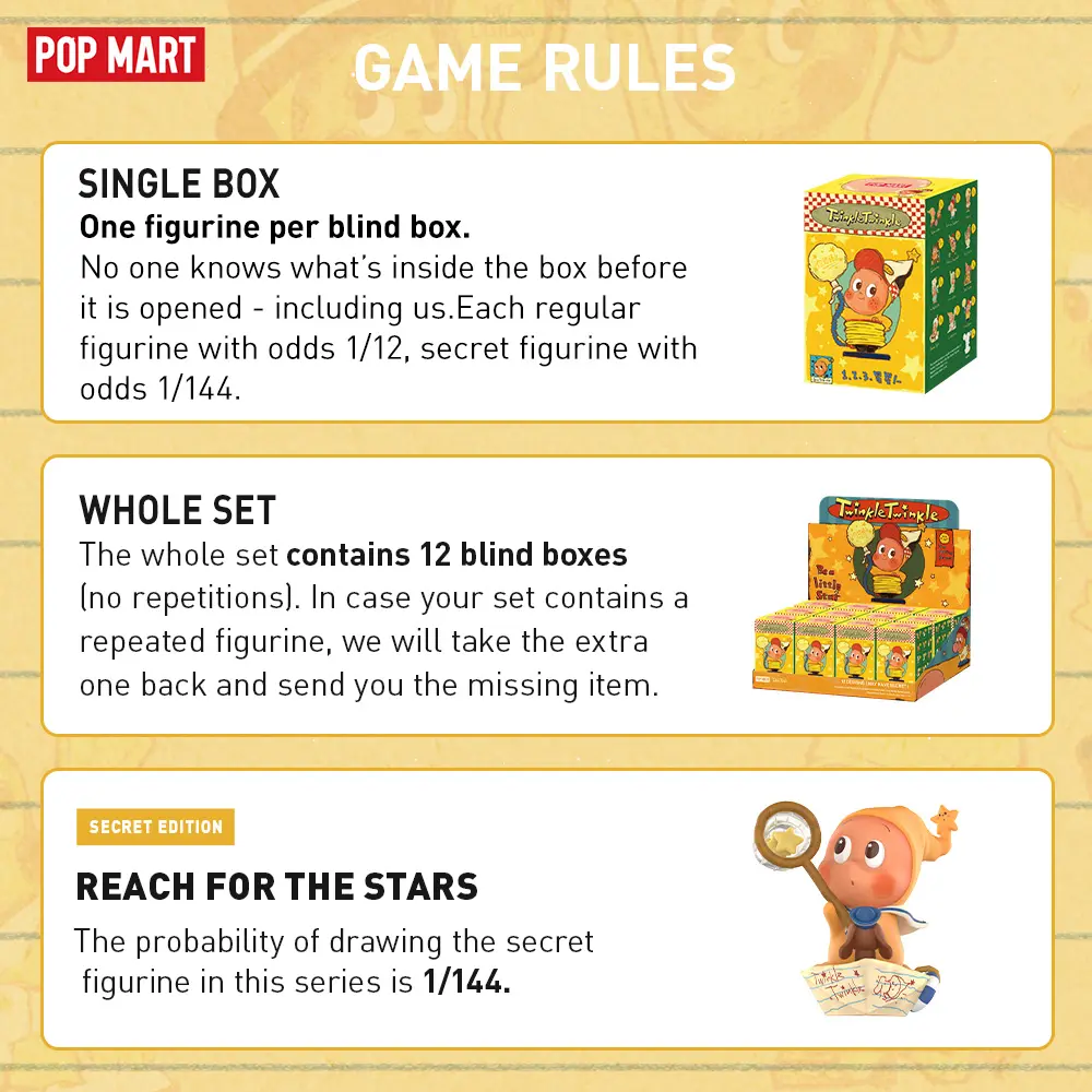 “Blind box” means no one knows which exact figurine of the series you may get before opening—nor do us. A regular figurine will be replaced if the secret edition appears in the whole set (big congratulations!!!)