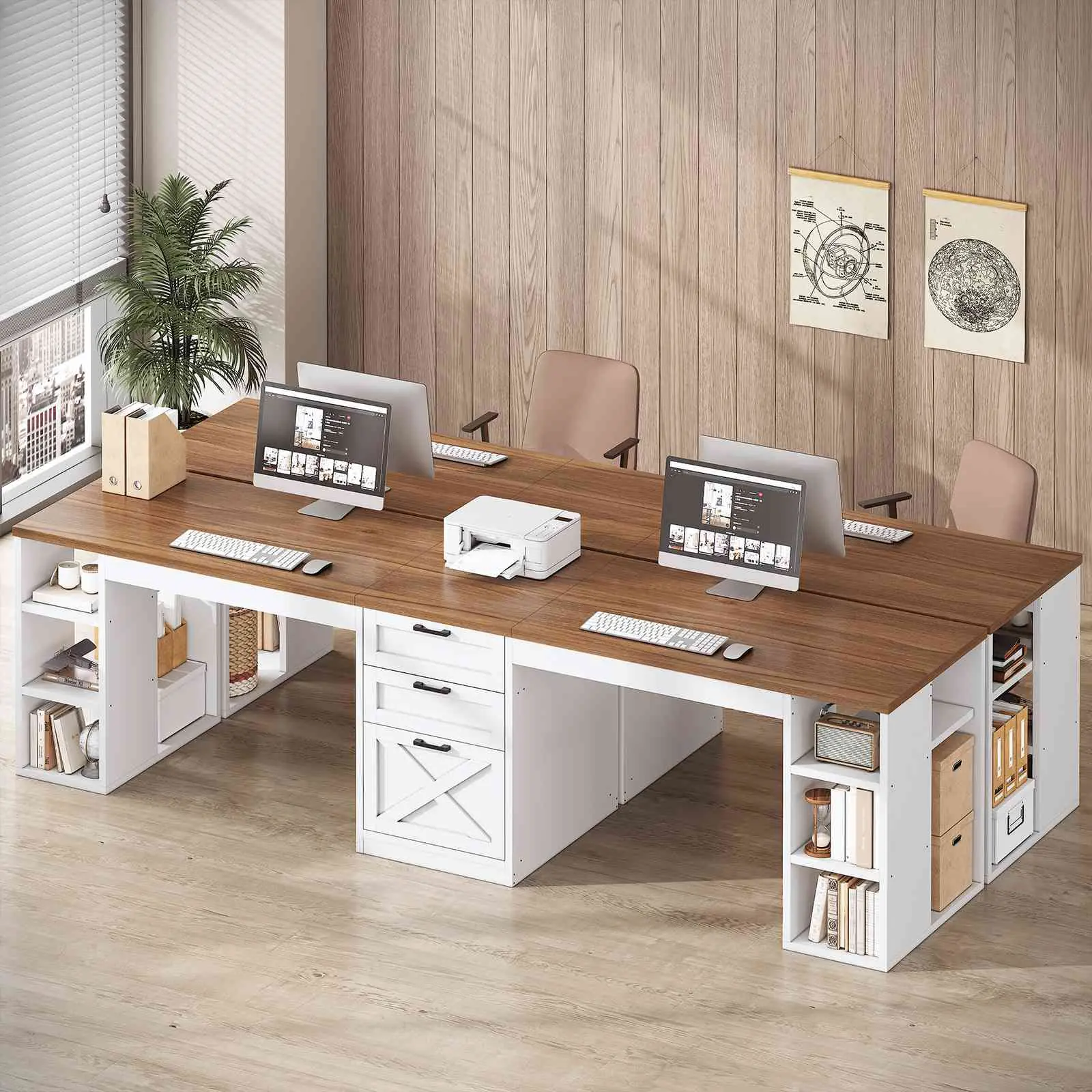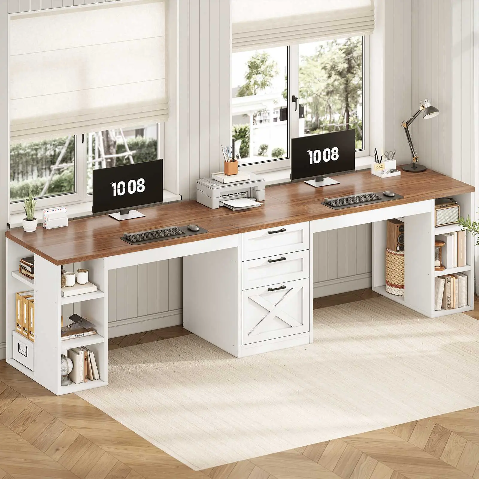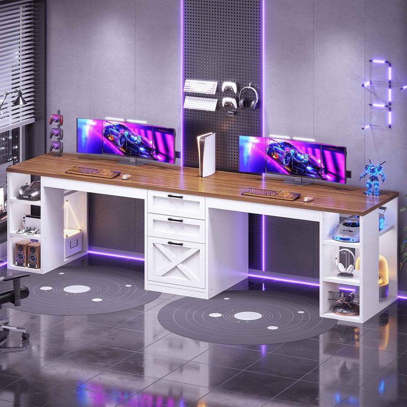 【What can you get】 2 person desk + printer stand with storage + storage drawers + open shelves. The desktop size is 96.5" L*19.7" W. This multifunctional two person desk is convenient for 2 people to use at the same time, and can communicate at close range without disturbing each other. Perfect as computer desk, 2 person desk, home office desk, gaming desk, office desk.