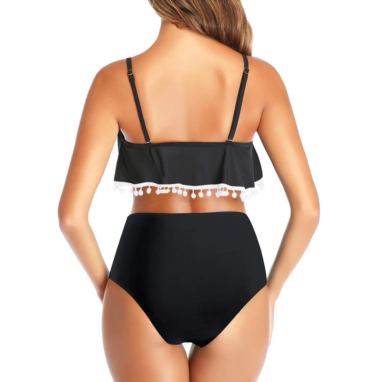 ·This two piece bikini swimsuit features stylish pom-pom tassel trim and a ruffled flounce flowy top. The scoop neckline flatters your silhouette, making it very cute and charming.