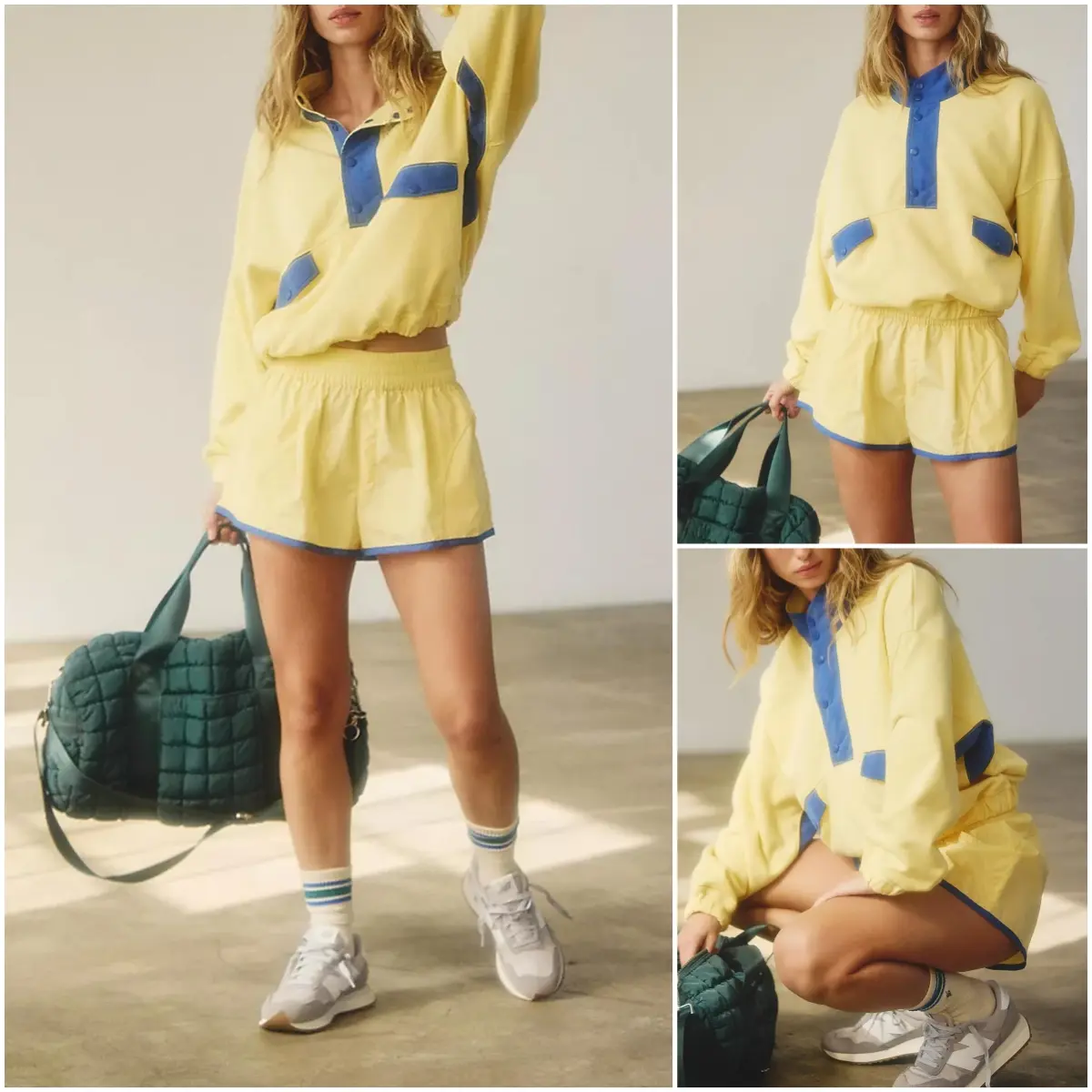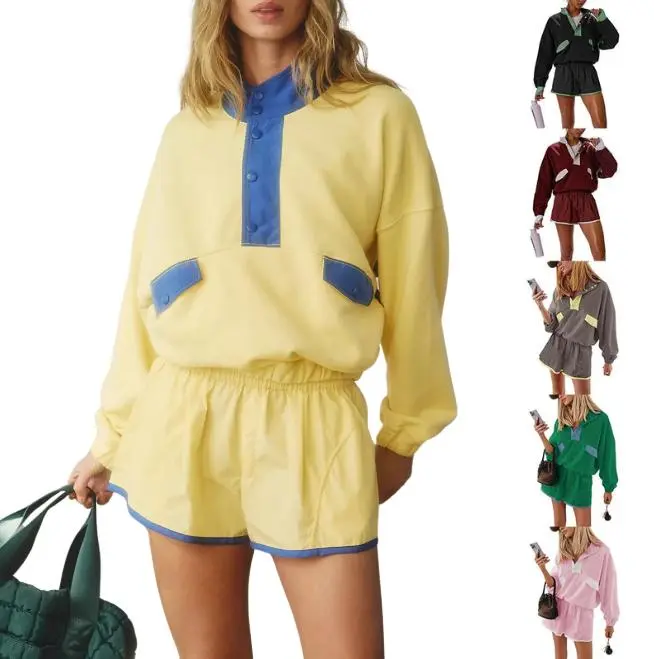 ·Features: 1/4 Button Closure Pullover / Long Sleeve Athletic Top / Stand Collar Sweatshirt Set / Color Block Stitching Set / Workout 2 Piece Shorts Set / Casual High Waist Shorts Set / Athletic Sports Workout/Two Piece Outfits for Women/Casual Tracksuit Sets