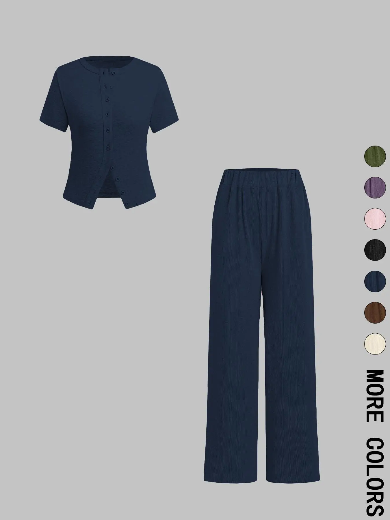 Women's Casual Solid Color Button-Up Short Sleeve Slim Top & Wide Leg Trousers Co-ord, Comfy Basic Two Piece Outfits #2PieceSet #ribbed #twopieceset #tanktop #widelegpants #dailywear #2pcs #shortsleeves  #tiktokshopbacktoschool #TikTokShopSummerTurnUp #us  #OOTD #fpy  #foryou