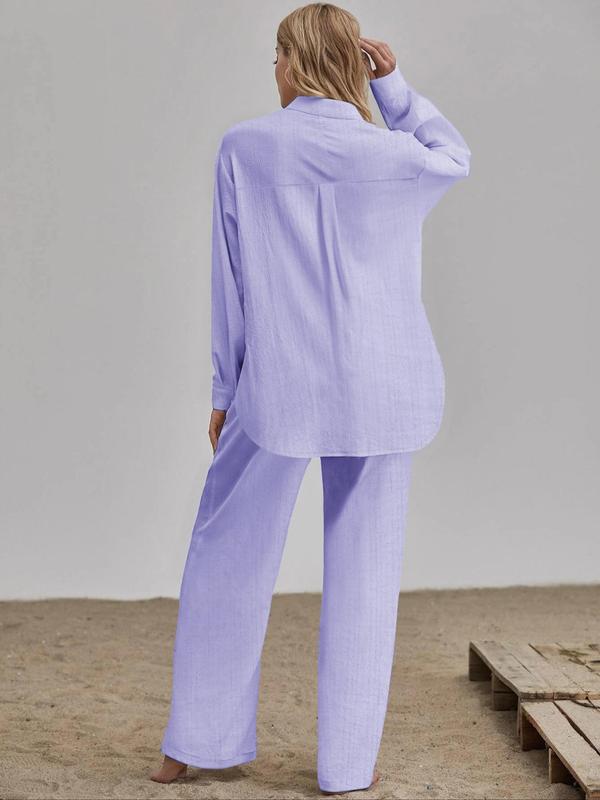 Two-piece Set Women's Solid Color Button Front Shirt & Wide Leg Pants, Casual Comfy Set for Daily Wear, Ladies Clothes for All Seasons, Casual Lounge Set