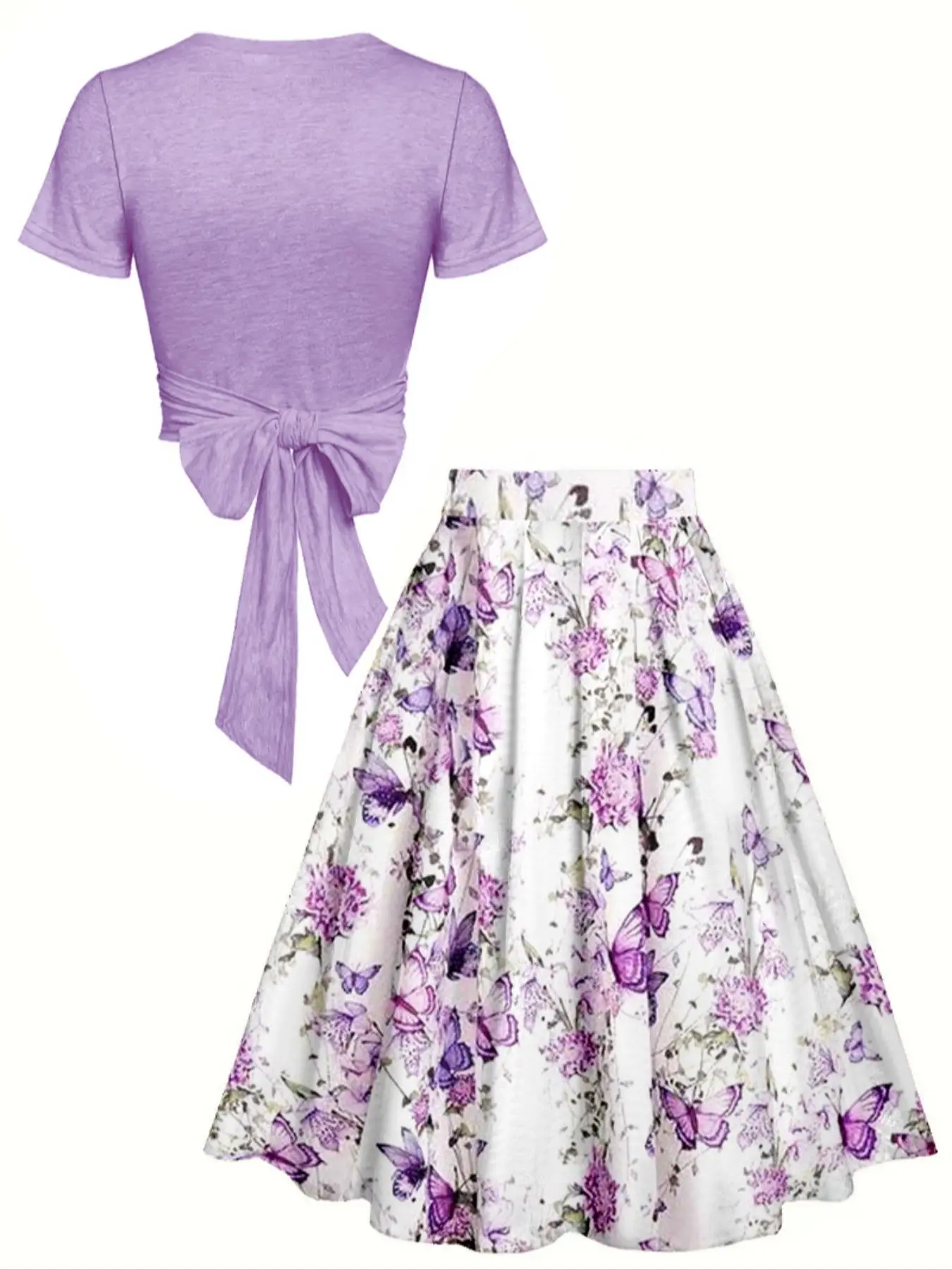 5. Women's Short Plain Top & Floral Print High Waist Skirt Two-piece Set, Casual Fashion Cozy Top & Skirt for Daily Outdoor Wear, Ladies Outfits for Summer Womenswear