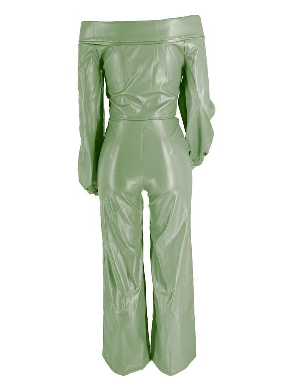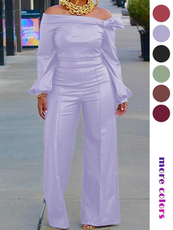 ăSeason Versatilityă: Perfect for transitioning seasons, this chic women's 2pcs plain off shoulder knot front bishop sleeve blouse & wide leg pants set is designed for both spring & fall, offering style and comfort in cooler weather.