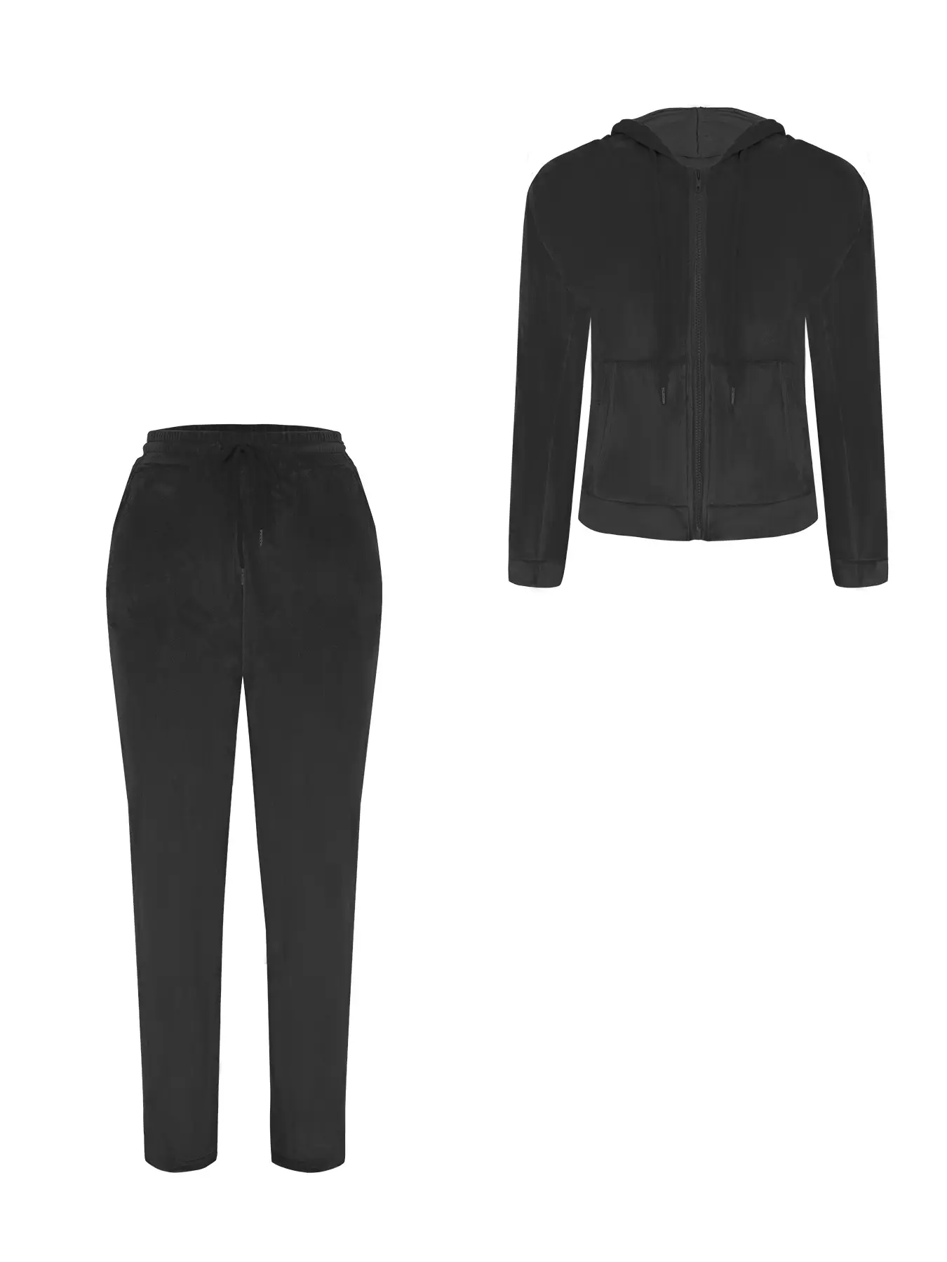 Two-Piece Set Women's Solid Knit Zip Up Hoodie & Drawstring Waist Pants, Casual Fitted Long Sleeve Hooded Top & High Waist Trousers for Daily Wear, Ladies Outfits for All Seasons