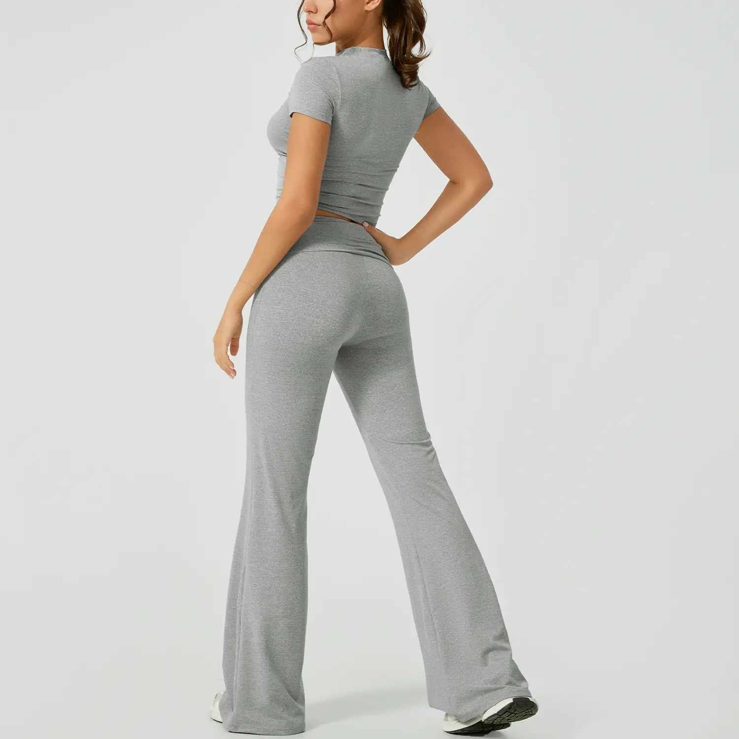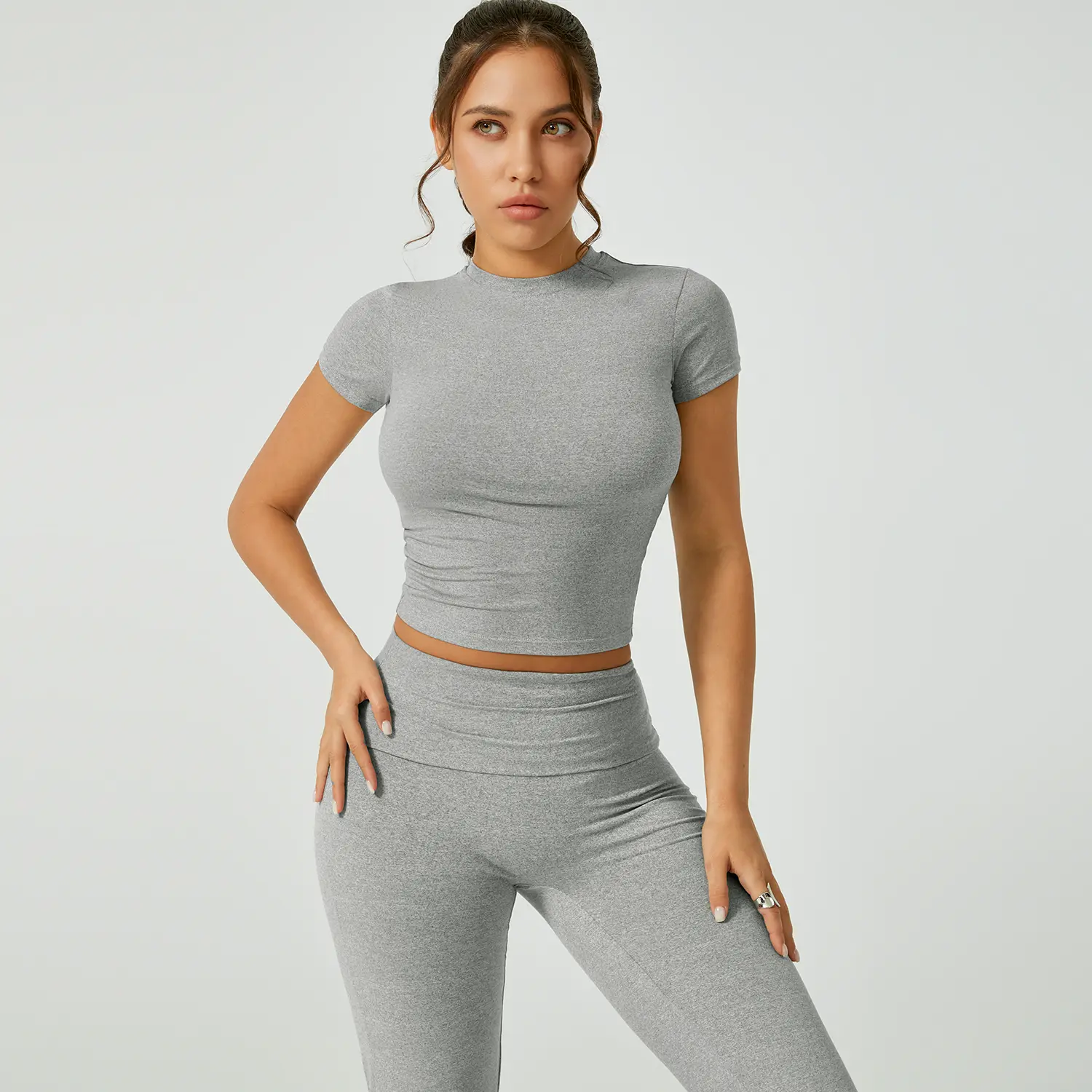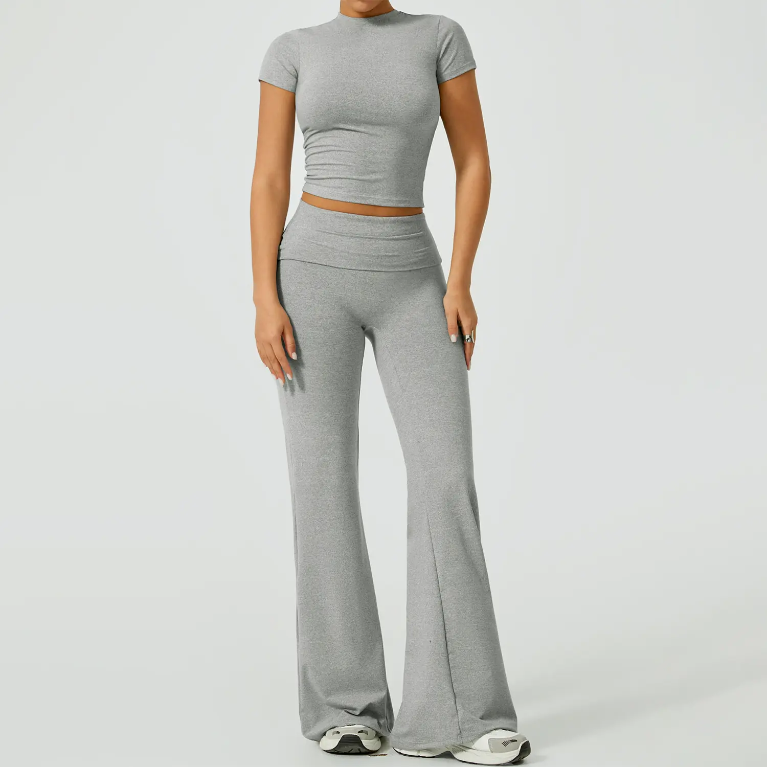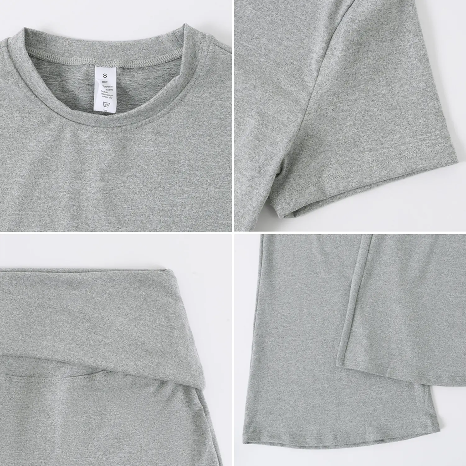 This is really cute. It's super soft, but I will say if you are using to work out I just know this will show all your sweat 🥲. Also I am 5'2 so it's a little long but I expected that but just for other petite girls to know. I got a size M which is my regular size and while the shirt fits fine. I am pear shaped and would need a L for the bottoms (29 waist and 42 hip at my widest). It only doesn't look tight here from the side but from the front it definitely is too tight and squishes my tummy unflatteringly. It's still cute tho. Maybe if i had less tummy?