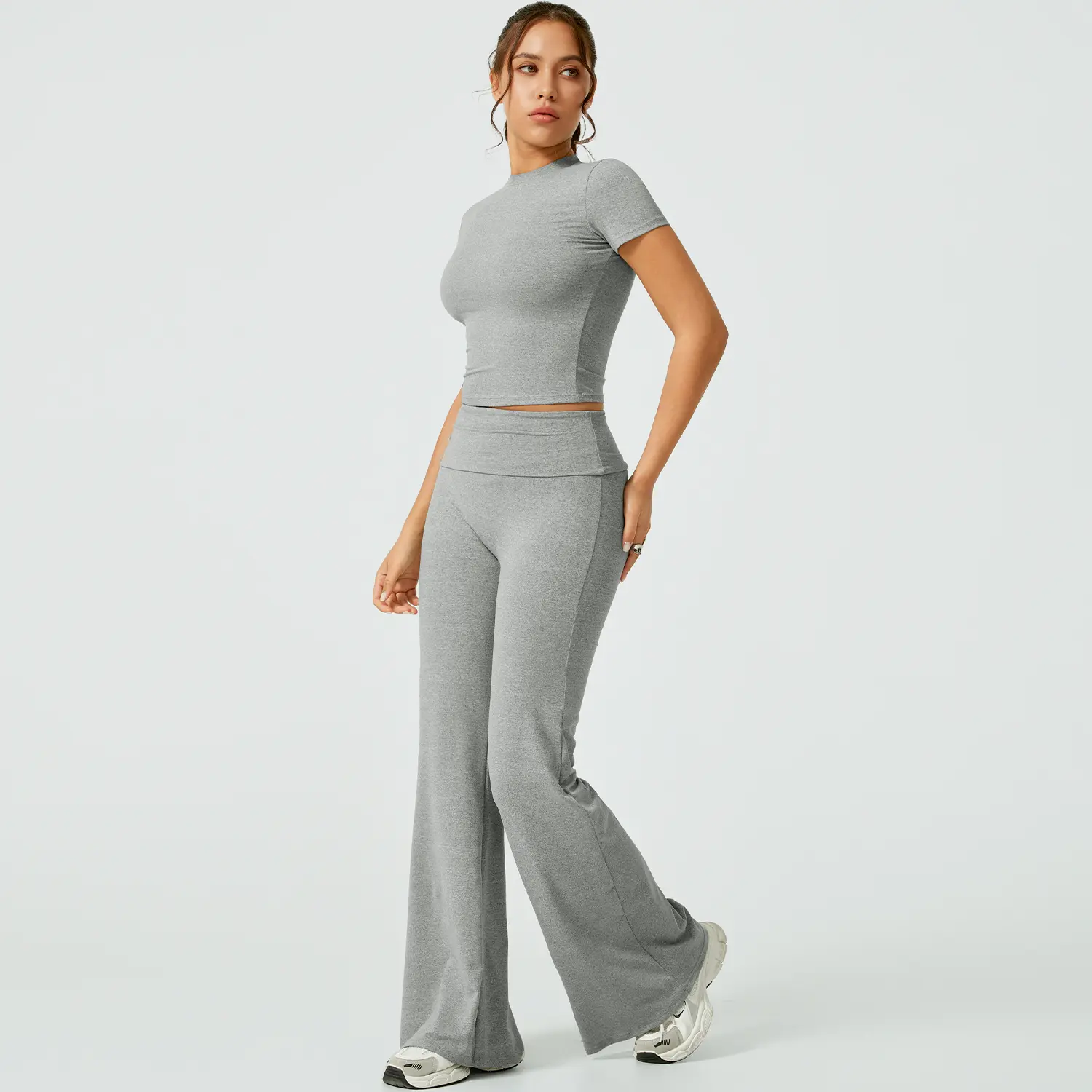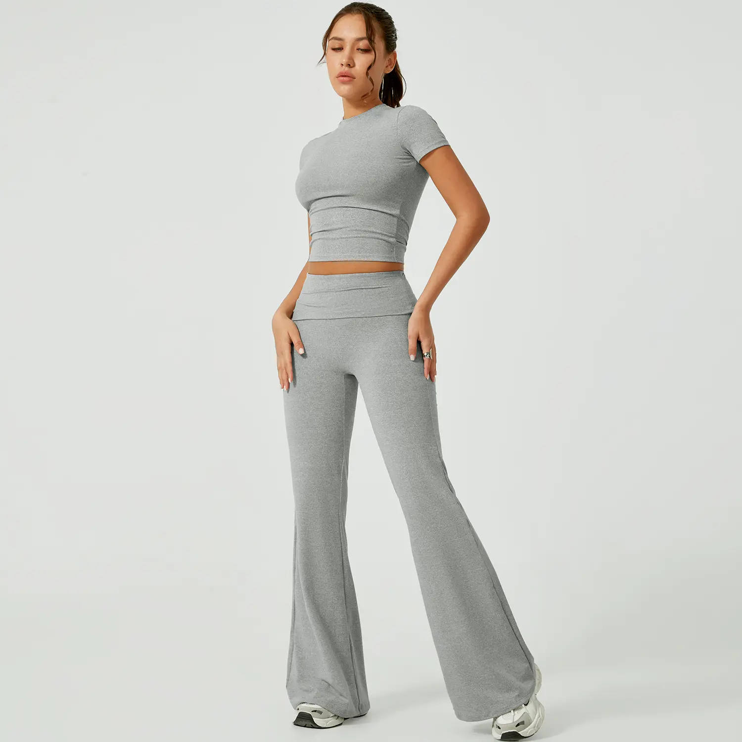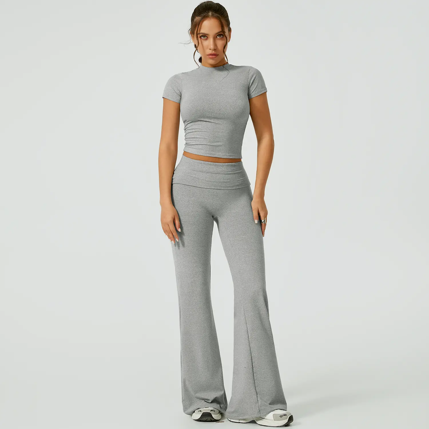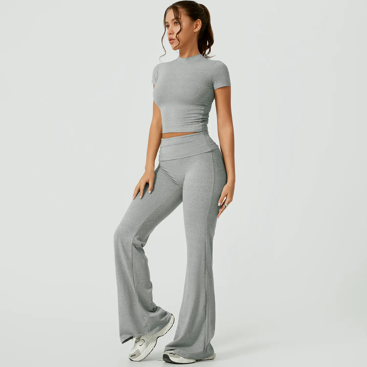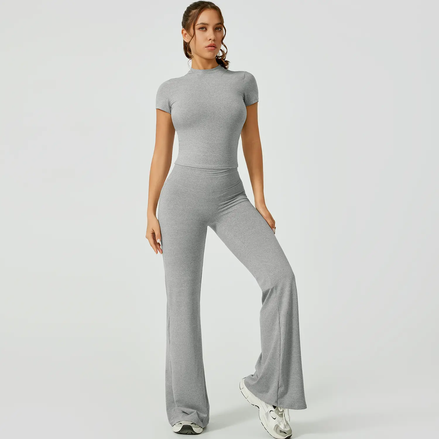 This is really cute. It's super soft, but I will say if you are using to work out I just know this will show all your sweat 🥲. Also I am 5'2 so it's a little long but I expected that but just for other petite girls to know. I got a size M which is my regular size and while the shirt fits fine. I am pear shaped and would need a L for the bottoms (29 waist and 42 hip at my widest). It only doesn't look tight here from the side but from the front it definitely is too tight and squishes my tummy unflatteringly. It's still cute tho. Maybe if i had less tummy?