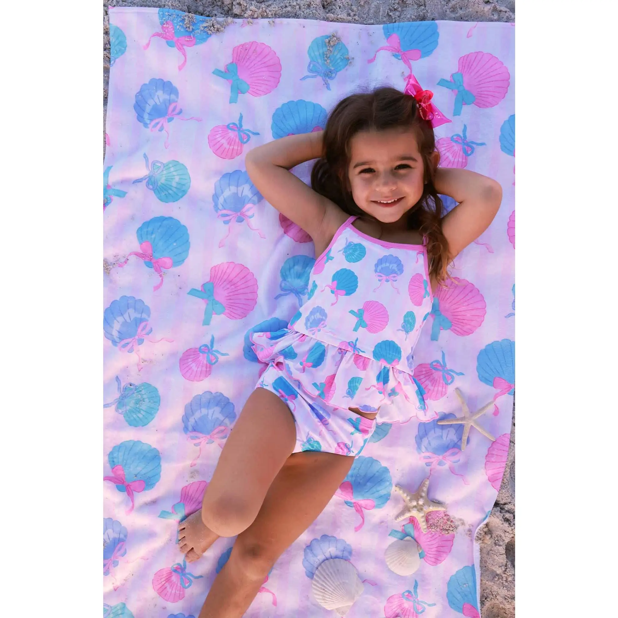 I’m the Sweet T. I bought this for my granddaughter. I love everything about this little swimsuit. Material is soft.The colors are perfect for the beach and so are sea shells and pearls. Precious swimsuit for my precious Palmer!☀️