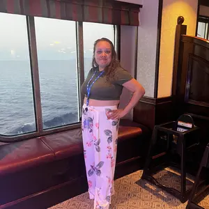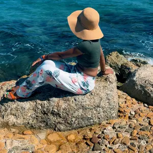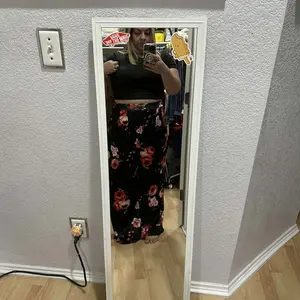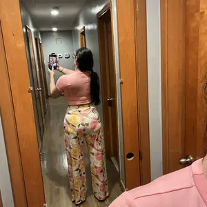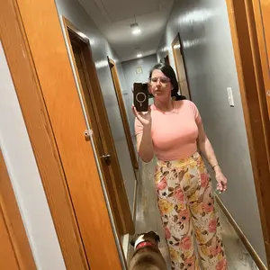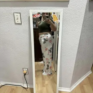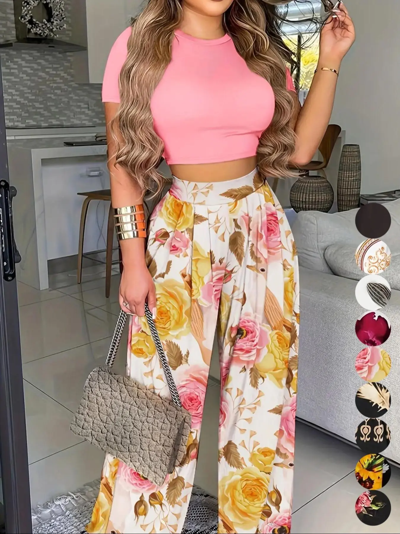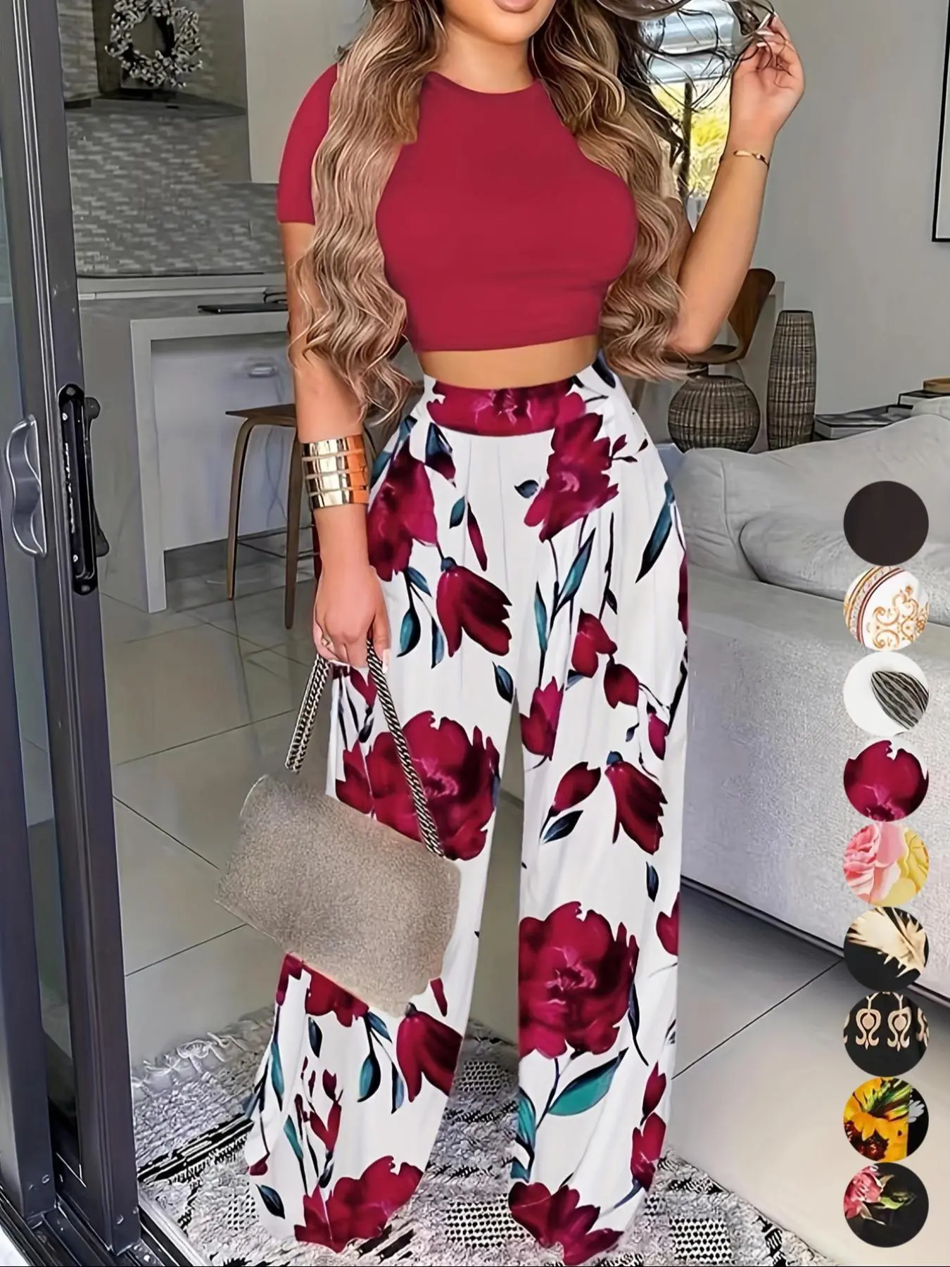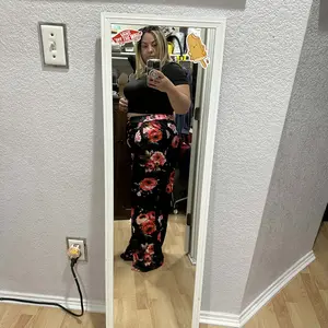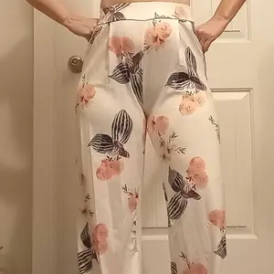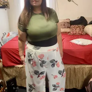 Comfy set , the top is short if you’re full figured so wear something inside or out dress it up , pants are over sized but comfy and the material is cool nice patten colors for summer wear 🥰 good product , I’m wearing a body shaper with it .