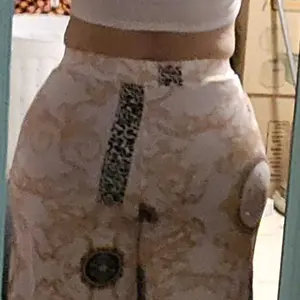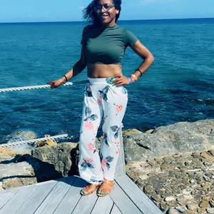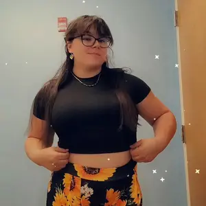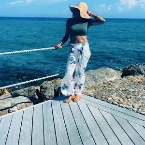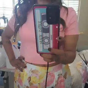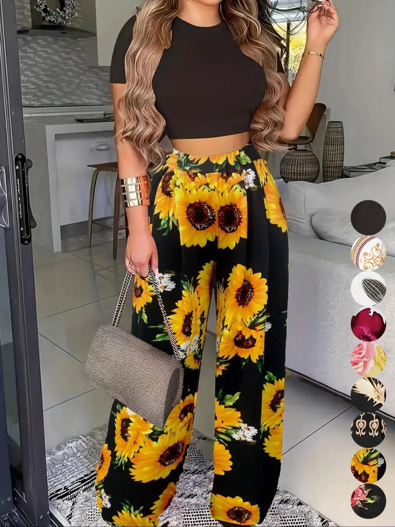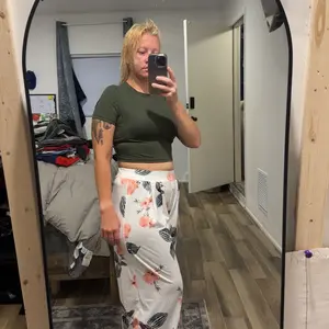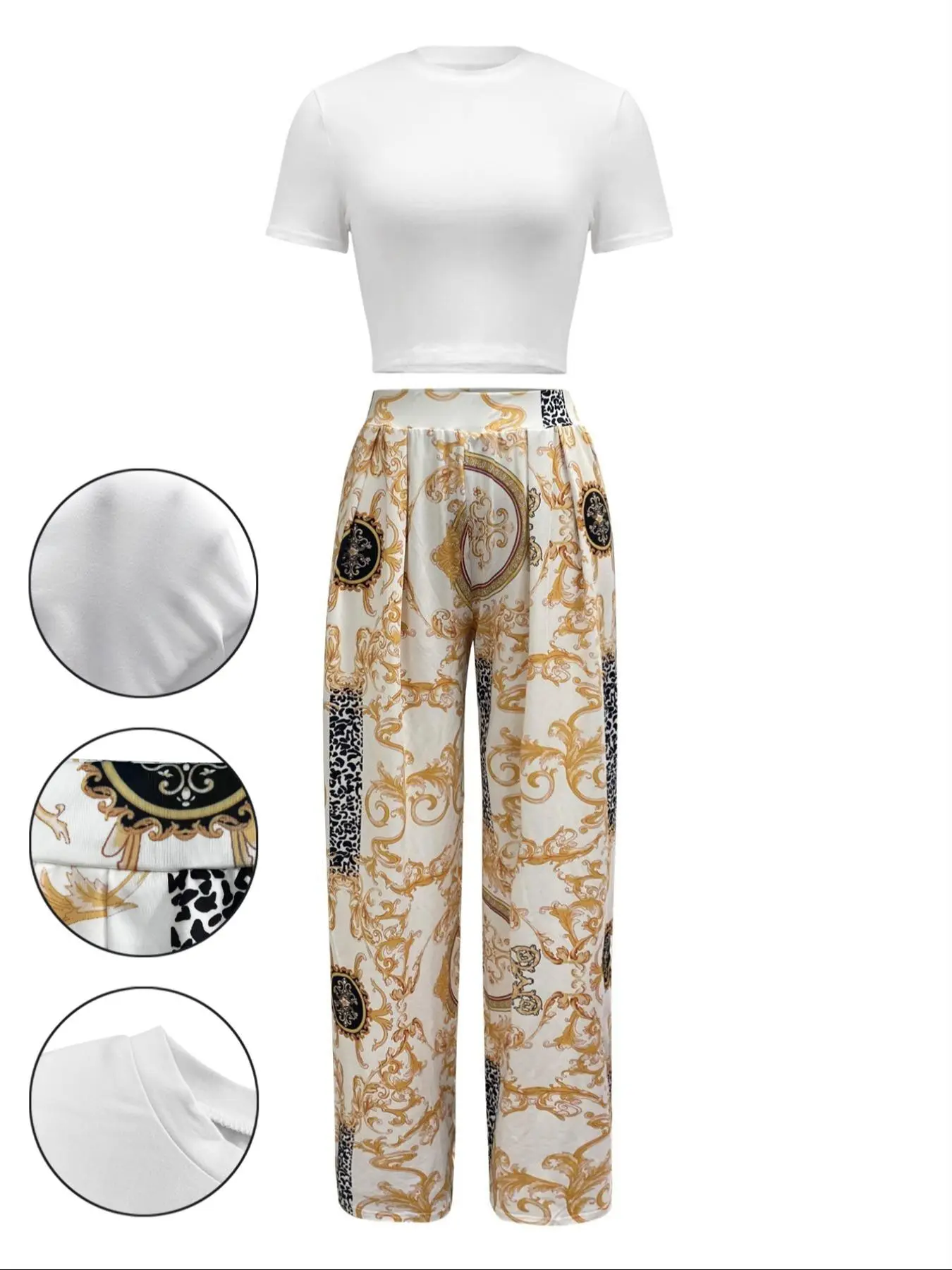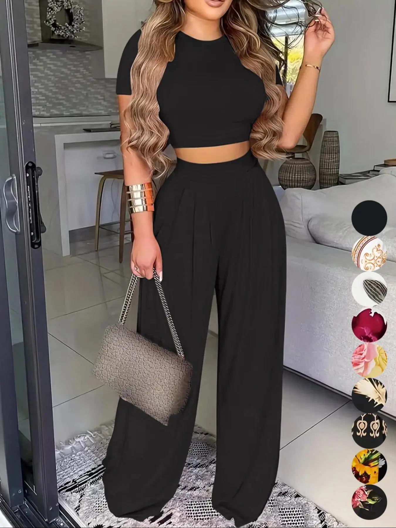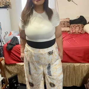 Crop top and baggy pants nice style, it’s comfy with some stretch to it. I’m wearing a shaper with my set because the top is short it’s a good summer wear material is cool not heavy nor thin either . Product made well .