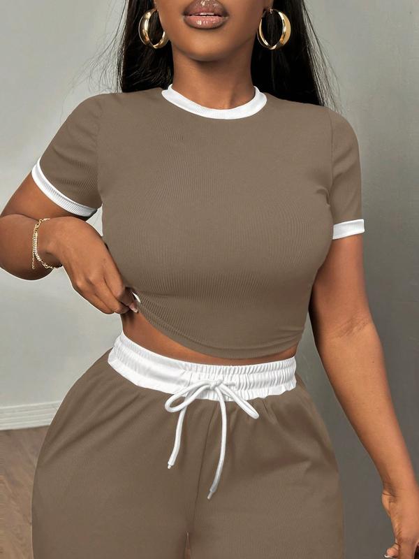 Women's New Casual Colorblock Slim Fit Round Neck Short Sleeve Top, Drawstring Waist Side Pocket Pants Two-Piece Set