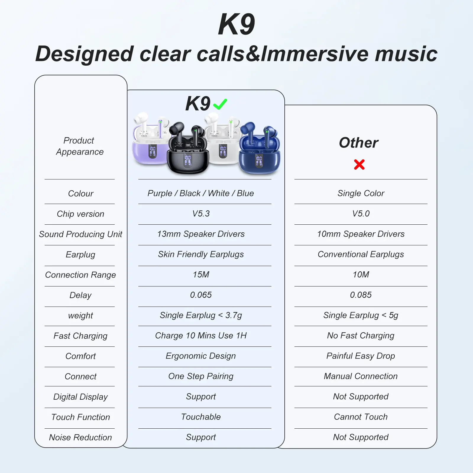 ·Auto Pairing: Remove earbuds auto power-on & pairing select “K9” in your Bluetooth settings