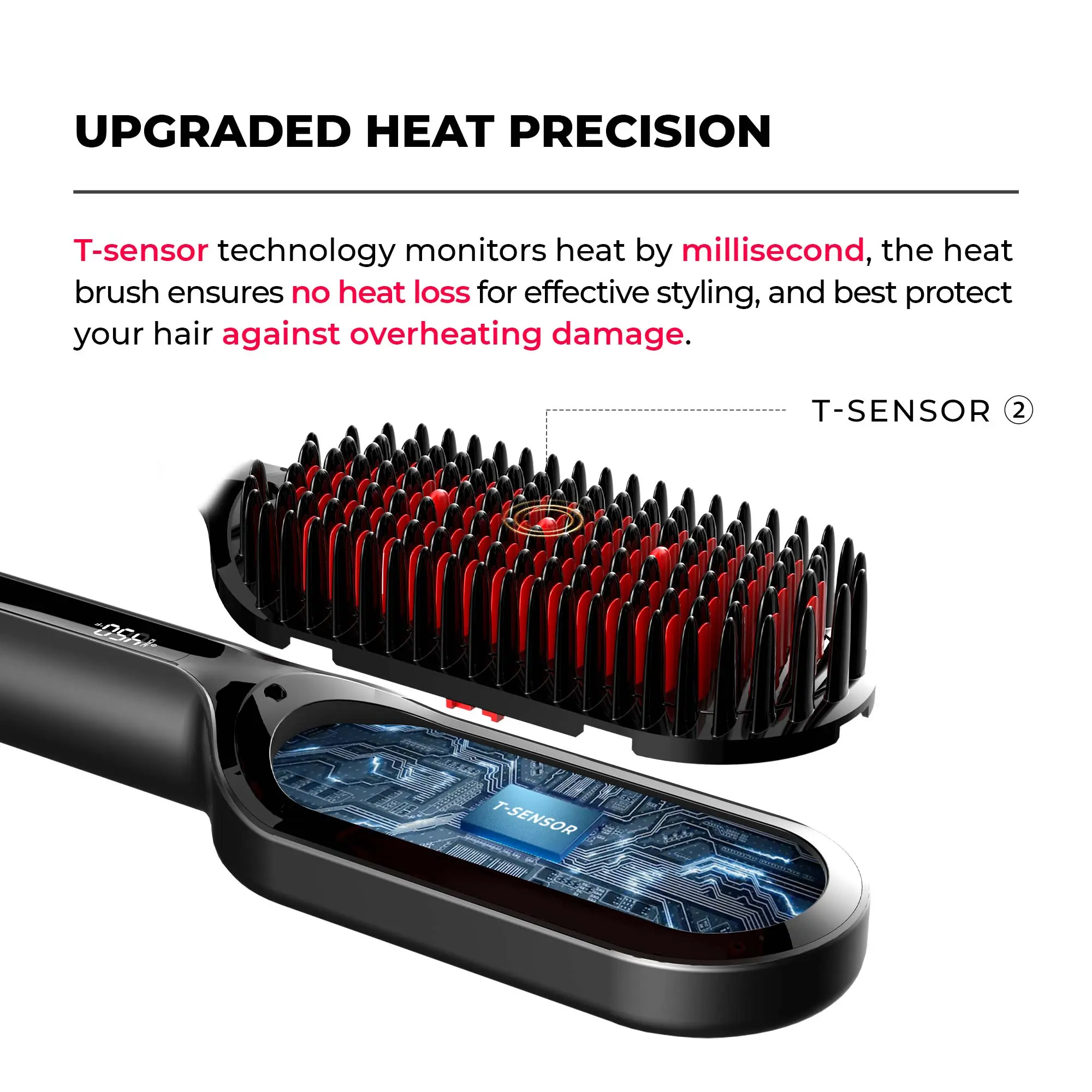 T-sensor technology monitors heat by millisecond and intelligently adjusts to your unique style. Combined with PTC heating and 16 temperature settings, the heated brush ensures no heat loss for effective styling, and best protects your hair against overheating damage.