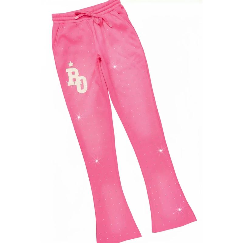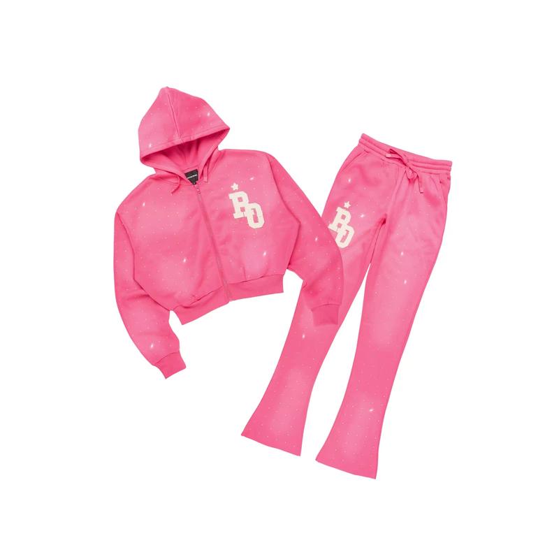A trendy two-piece zip-up crop jacket and stacked track pant set for women in pink. Designed with ultra soft organic cotton and custom rhinestone detailing for the perfect everyday set.