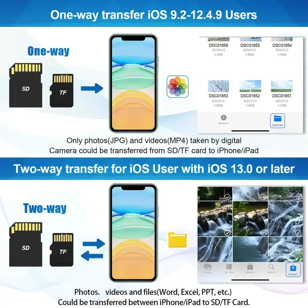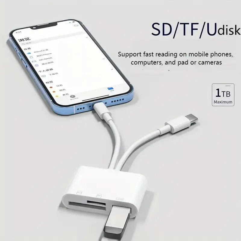 ·[Plug and Play]: The SD card adapter is a convenient and easy-to-use device that allows you to transfer data between your memory cards, USB Flash Disk(Supports a maximum of 1TB USB flash drive and USB hard drive) and your iphone, ipad. It supports SD and TF memory cards, making it compatible with a wide range of devices. With no need for additional drivers or software