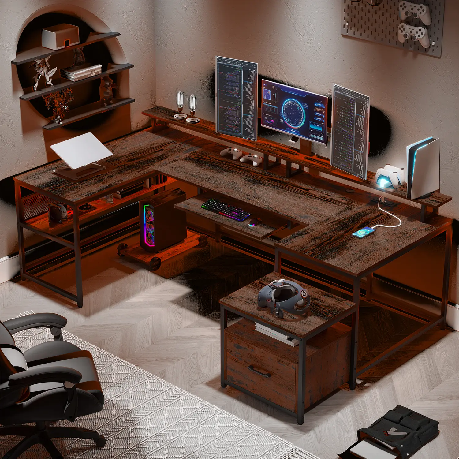 "PS5 meets museum vibes! 🎮✨ Sedeta's RGB gaming desk has built-in trophy cases for your headset/figurines + 16 color modes. Secret cable tunnels keep it clean AF! Swipe up for 25% OFF - perfect for late-night Valorant sessions. 📦 Free shipping over $199! #GamingRoom #SetupInspo"#sedeta