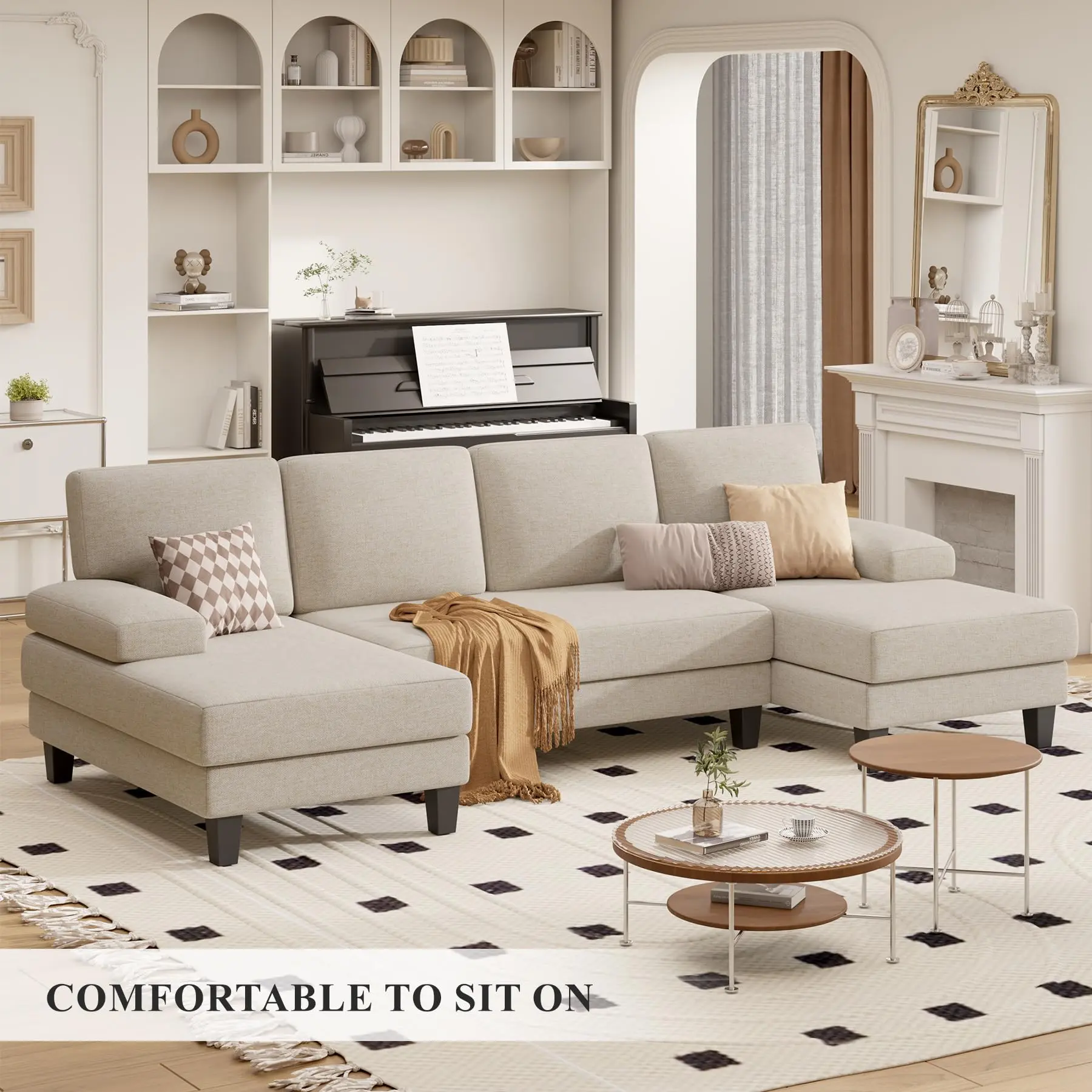 ·【DOUBLE CHAISE SEATING】The sectional sofa features a classic U-shaped design that is lines-clean and modern. The double sleepers add comfort and versatility for living room.