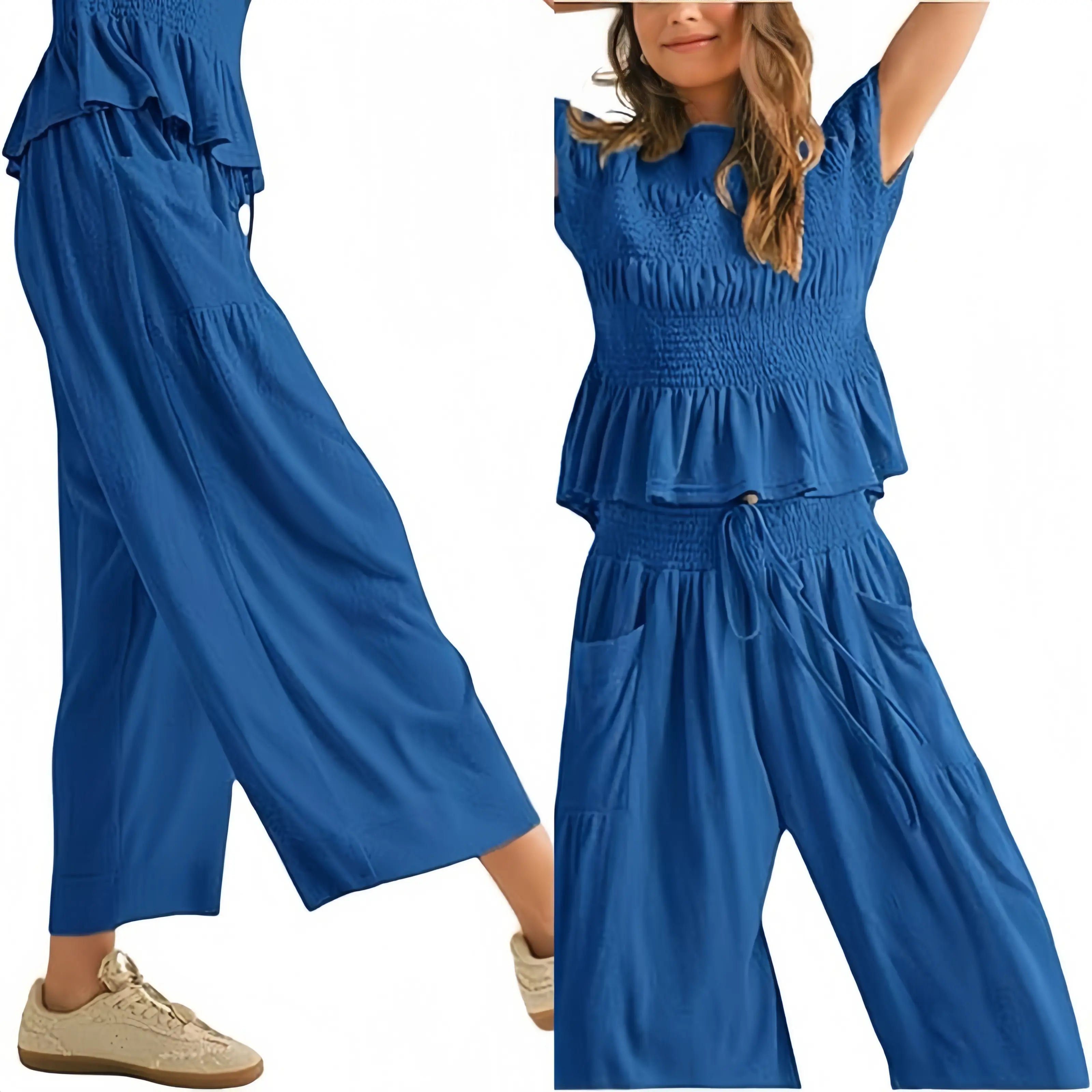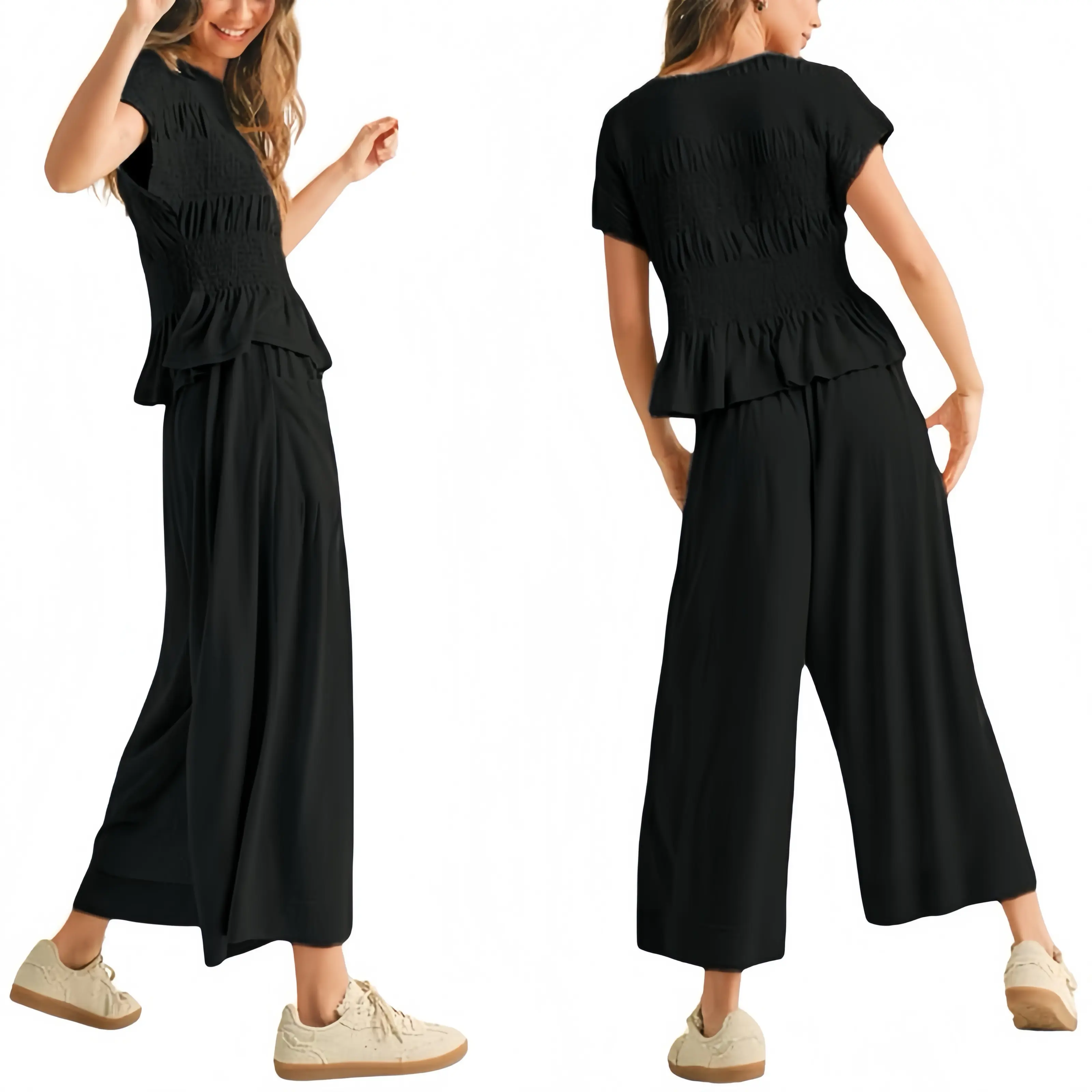 High-waisted flowy design elongates legs; functional side pockets for essentials. Versatile outfit – Wear as a set or mix and match; perfect with sneakers or heels.
