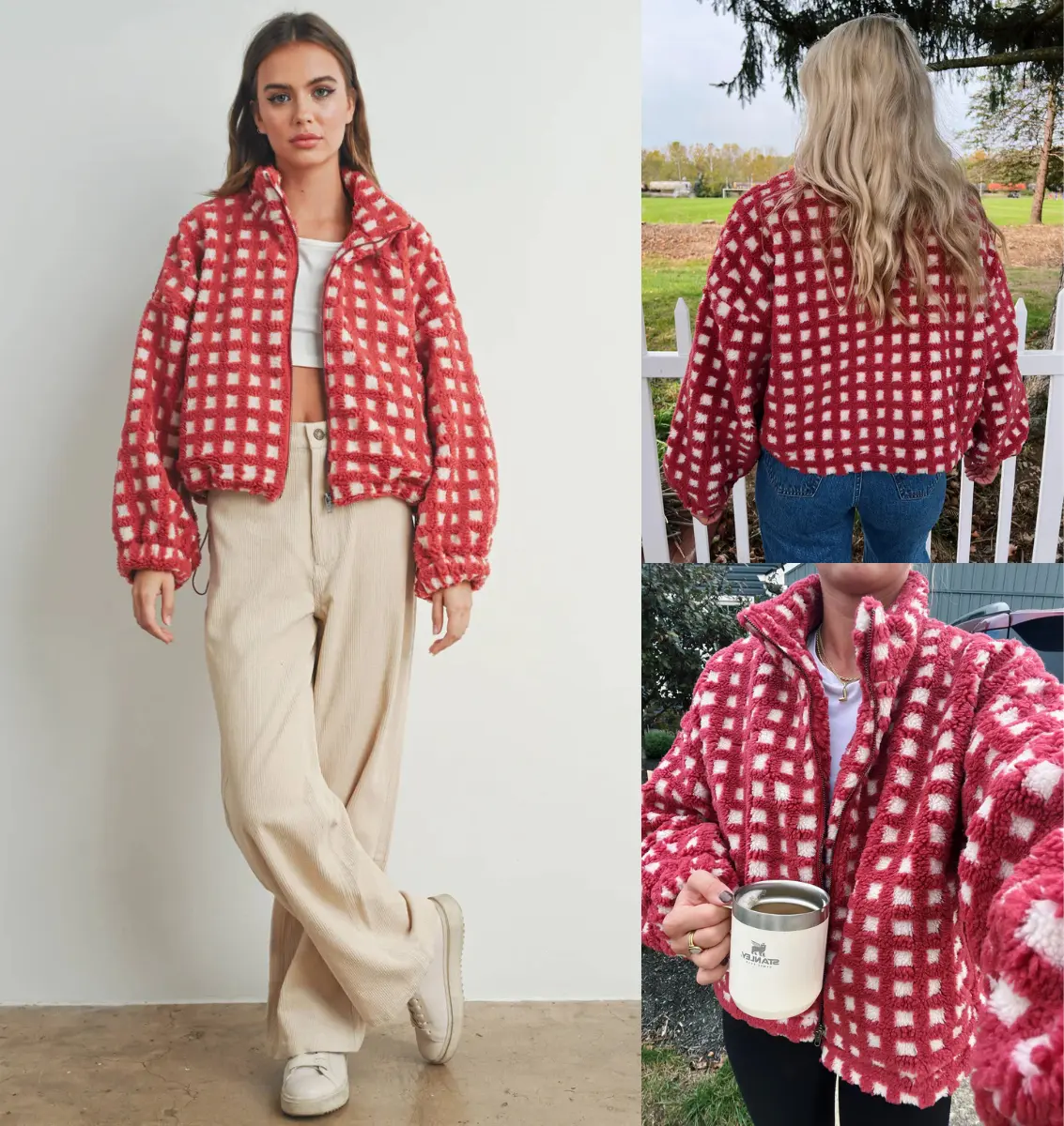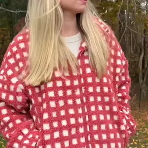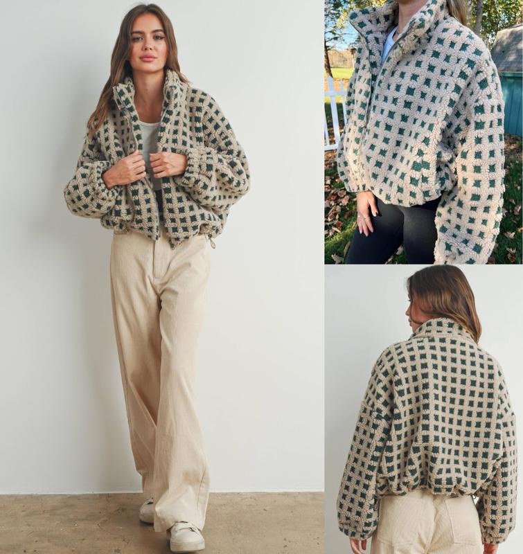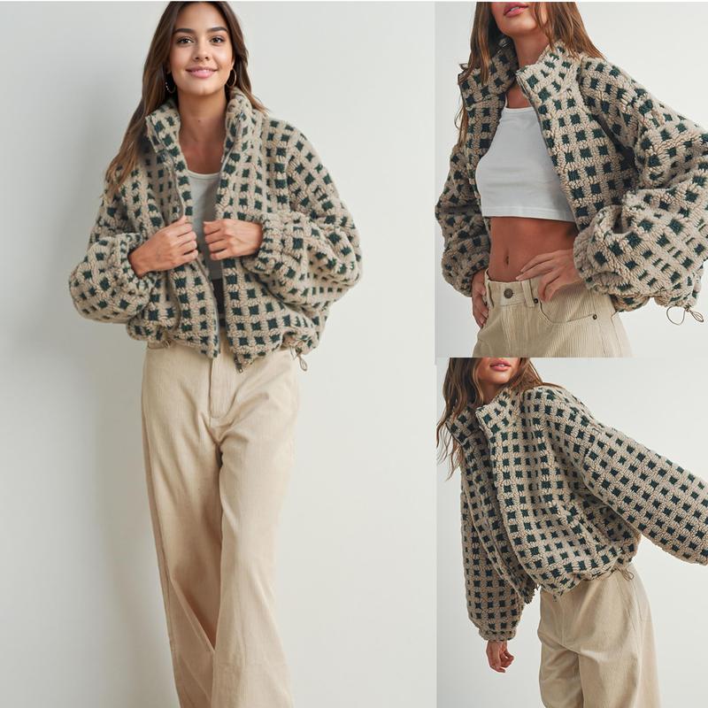 ·Cropped teddy checkered coat for women, relaxed fit, drop shoulder, lapel collar, zip front closure, special elastic cuffs and hem design, bottom edge with adjustable drawstring for loose hem, vibrant youthful color scheme for women