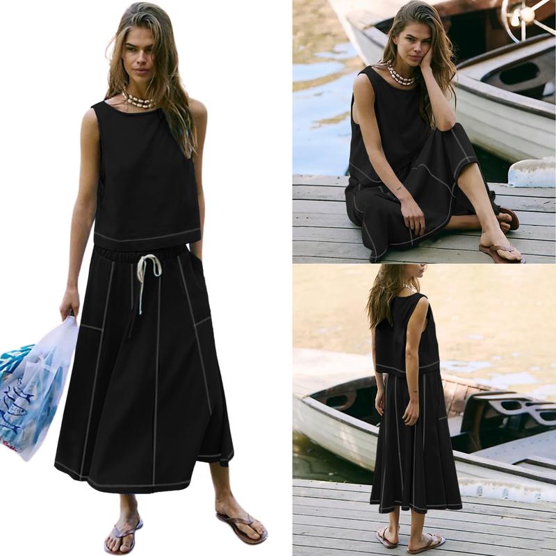 I was hesitant since I’m not built like the model (5’2”, 160, large chest), but this set is AMAZING. I ordered a large and it fits perfectly. Great for short waists and curves, ankle-length, and the crop top gives coverage. Such a comfy, flattering summer staple!