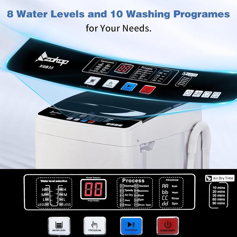 4.Easy to Operate & Time/Water Control, With a multifunctional control panel and LED display, easy to operate with one button. Our small portable washing machine has 10 programs and 8 water level selections for you to choose, meet specific laundry wash load needs.With this multi-functional washing machine, you will get a tailor-made service for more convenience.