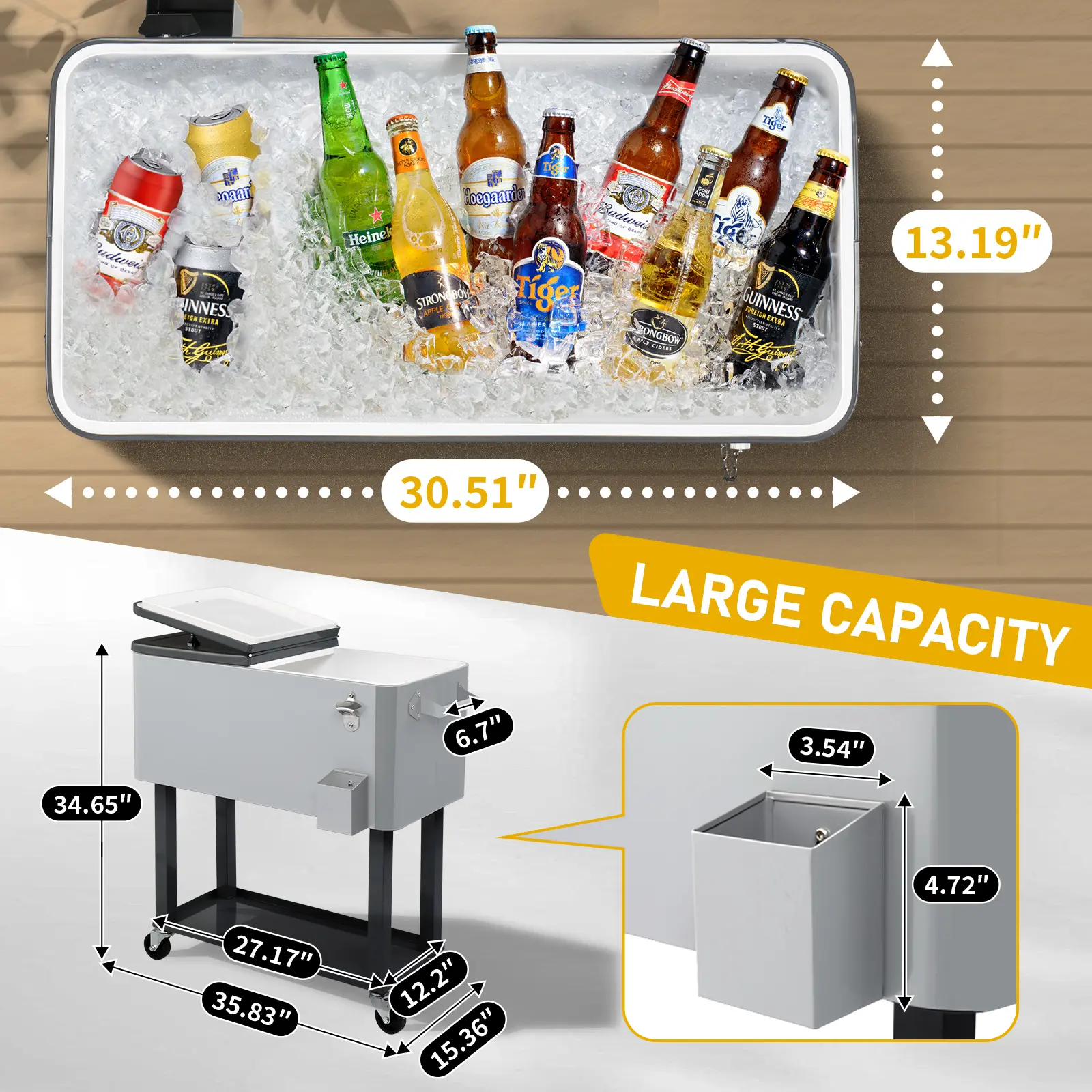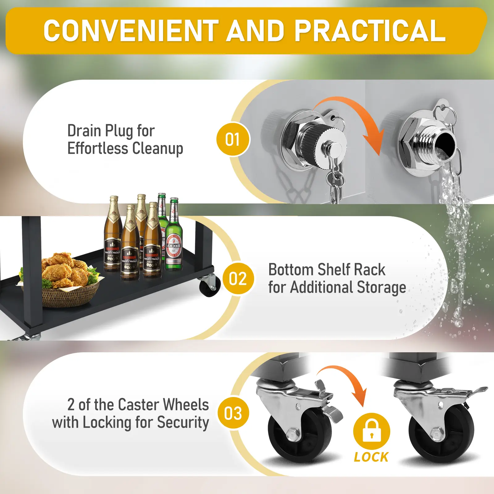 Are you looking for a high quality cooler? This 80QT Iron Spray Cooler with Shelf is highly recommended to you! Adopting high quality iron spray material, it features stable, sturdy, durable and environment friendly. Besides, it has two directional wheels, so you can stop at any time. It also features bottom tray design, convenient to carry things. What's important, it has warm and cooling functions. It can keep the warm food above 40 ℃ for 4-5 hours and preserve cool for up to 48 hours with ice sheet. So what are you waiting for? Don't hesitate, it's worth buying!