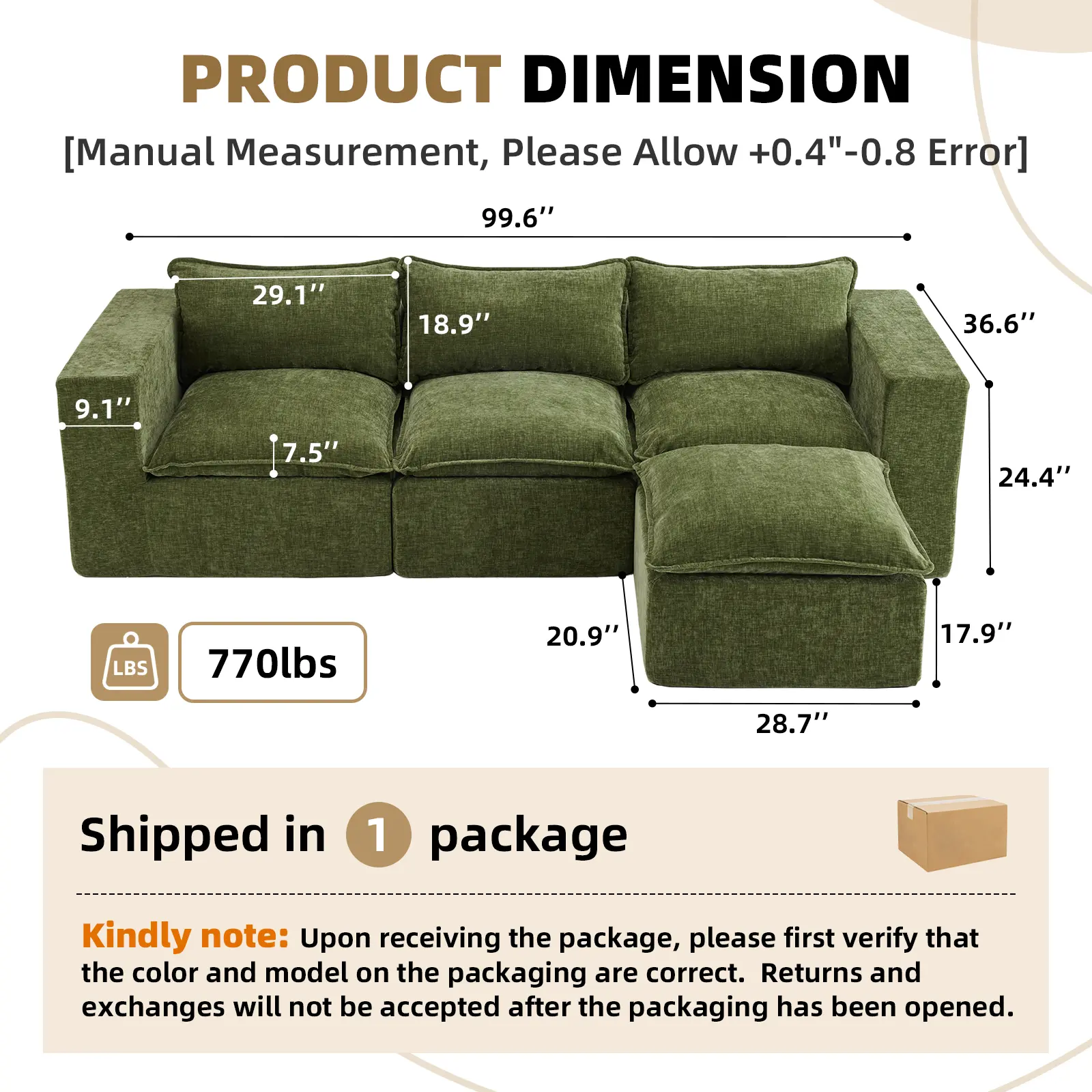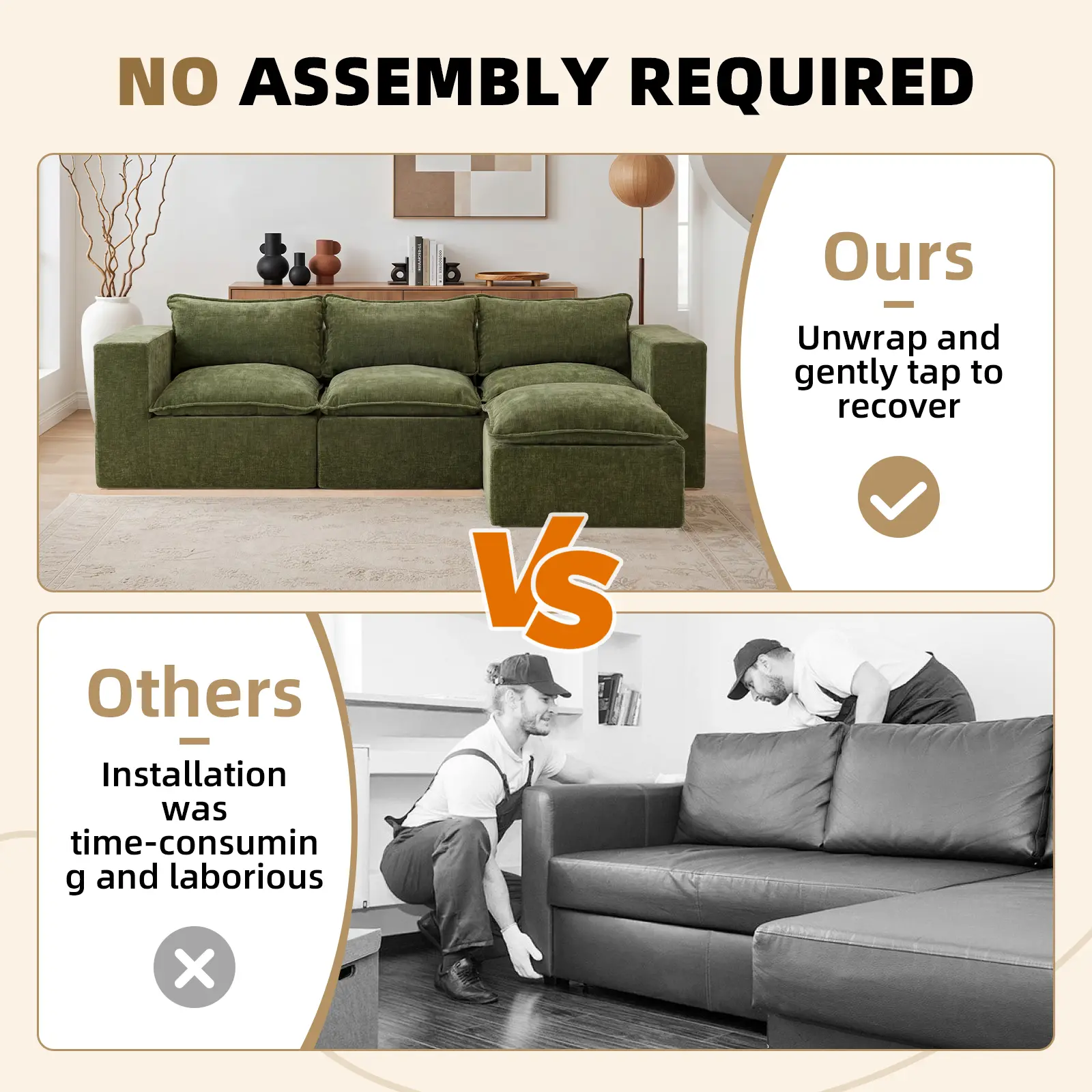 Skip the hassle of traditional furniture—no tools, screws, or complicated instructions needed. This sectional sofa arrives vacuum-packed for safe delivery and easy handling. Simply unbox, remove the packaging, and let each piece expand naturally. Within 72 hours, the cushions fully regain their shape and comfort. With no learning curve, it’s ideal for apartments, first homes, rentals, or housewarming gifts—effortless, intuitive, and stress-free from day one.