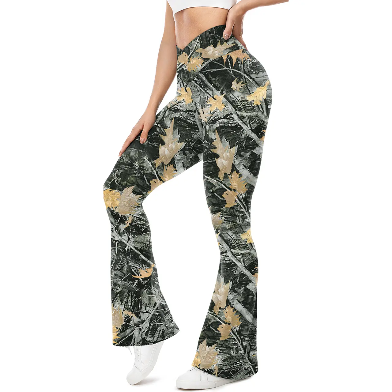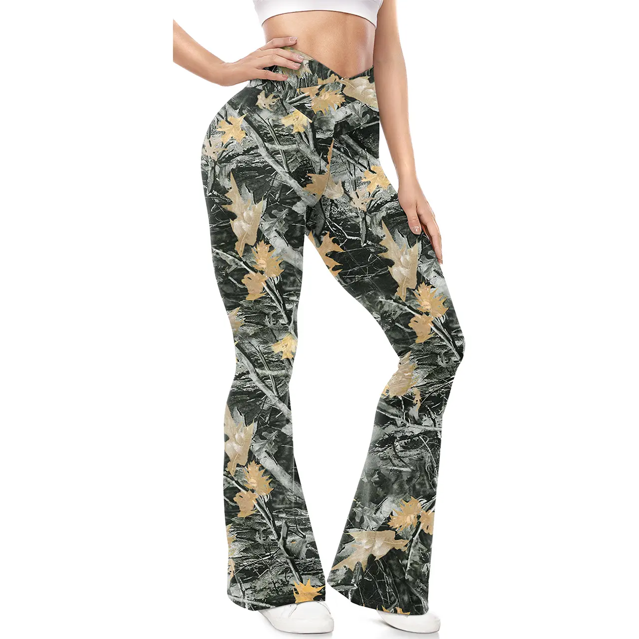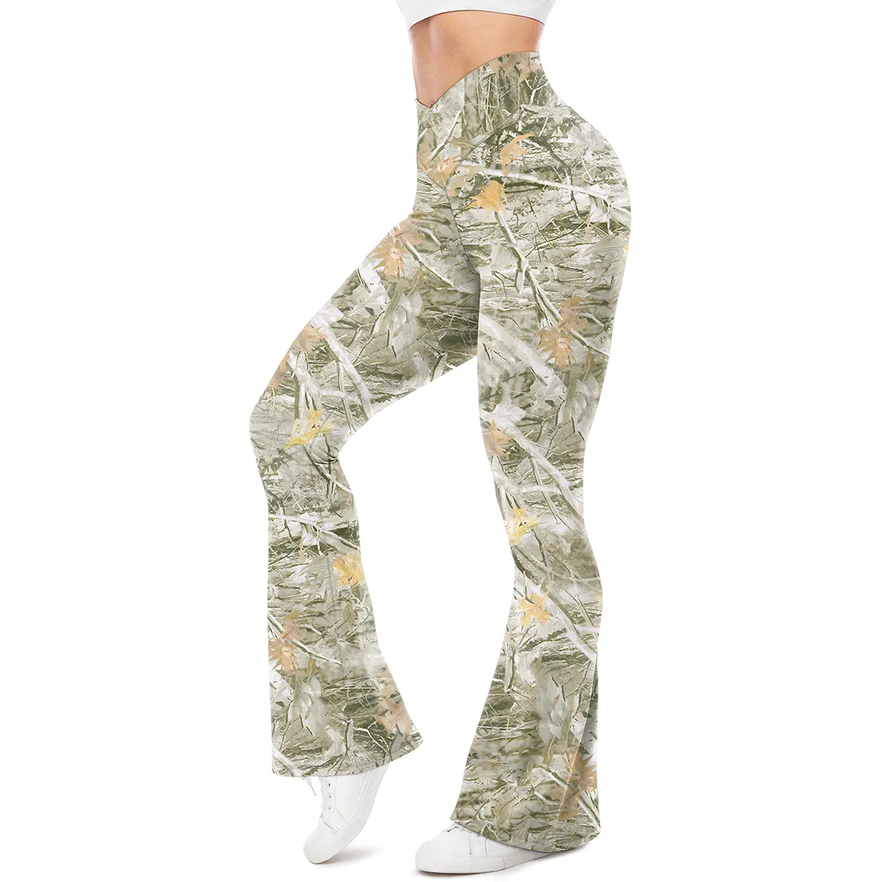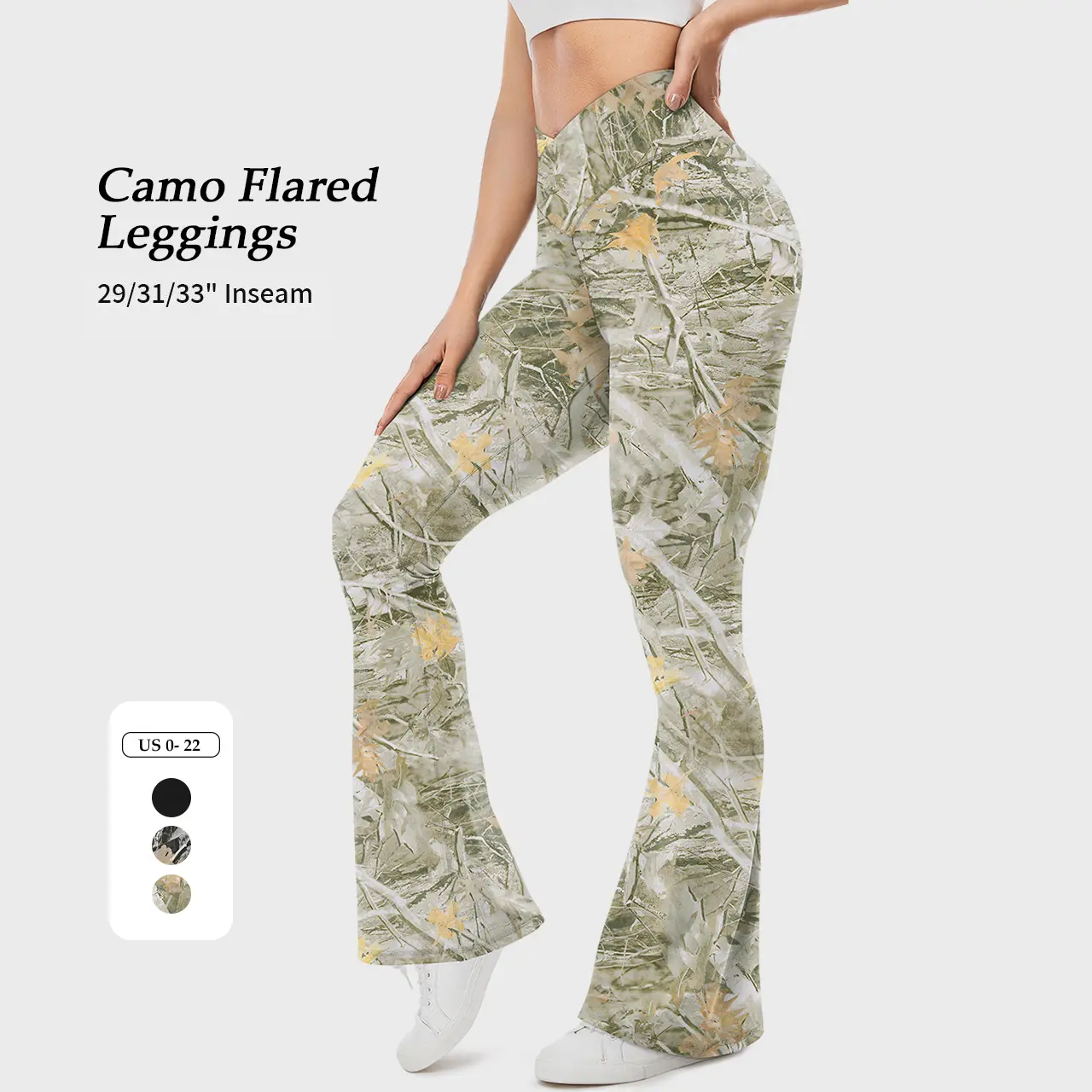 Flattering leggings with V crossover high waistband and flowy flare give an elegant look. Perfect for yoga, pilates, and beyond, providing all-day comfort.