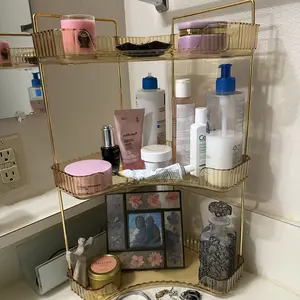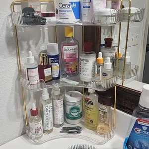 UFORU 3 Tiers Corner Bathroom Counter Organizer, Clear Countertop Shelf Storage Rack, Cosmetic Perfume Tray Standing Holder with Gold Metal Pole, Skincare Sink Organizer for Vanity Kitchen Transparent Smooth
