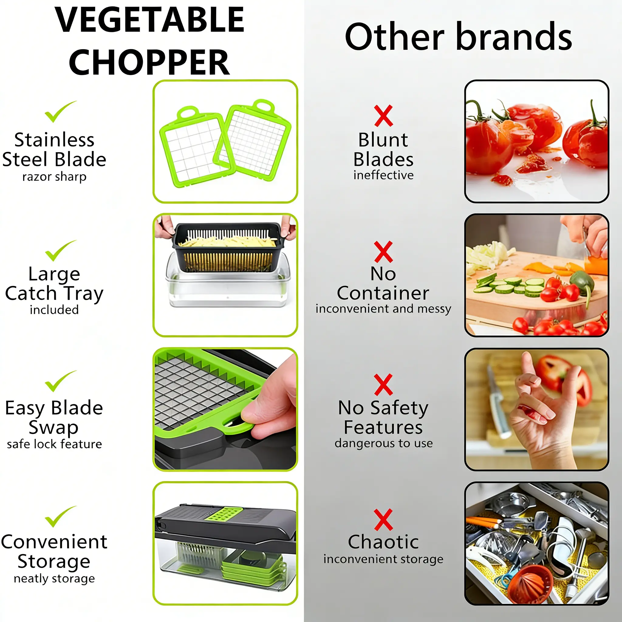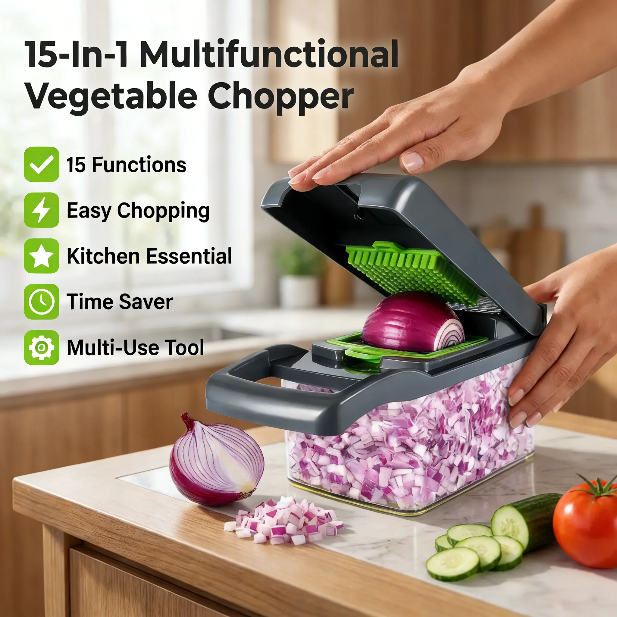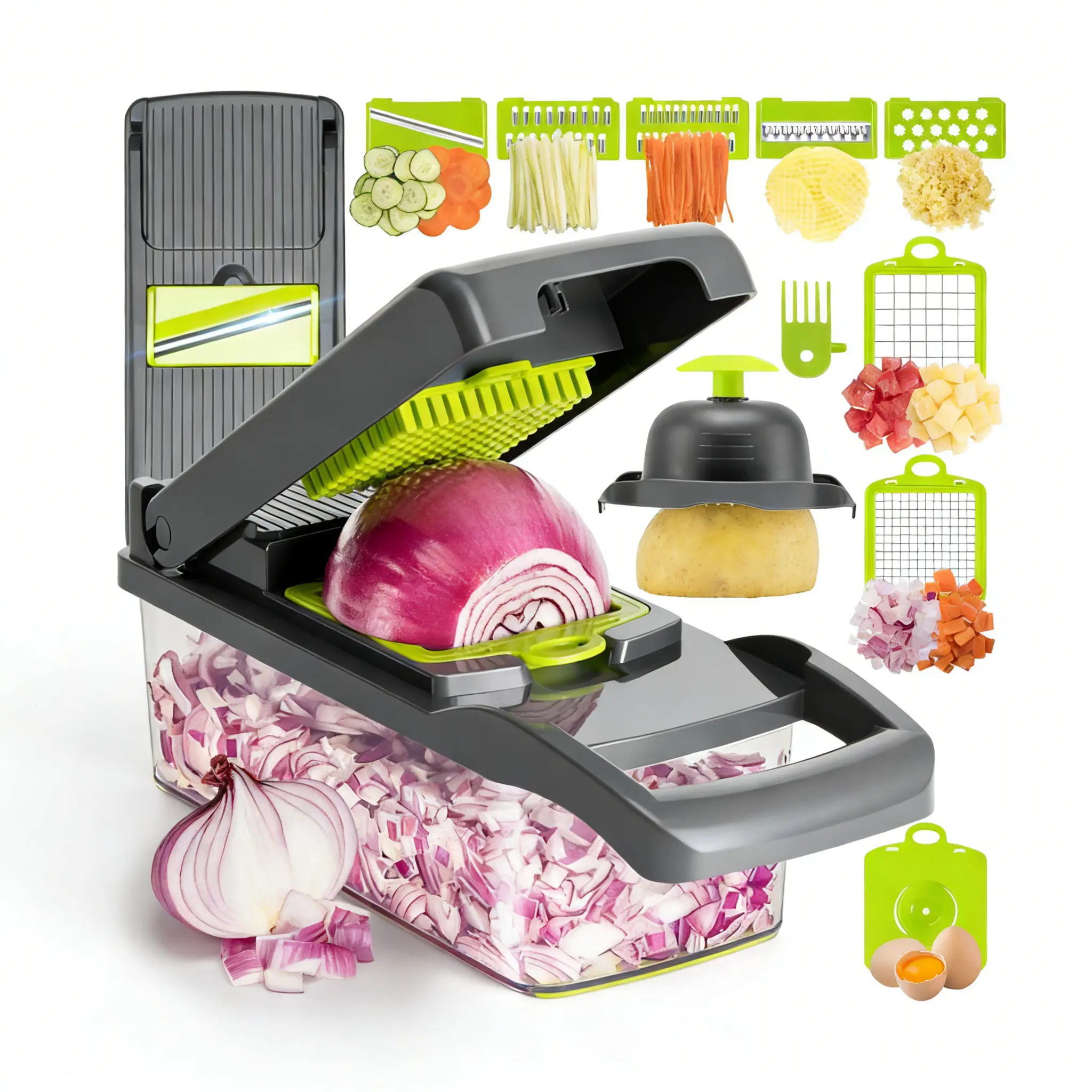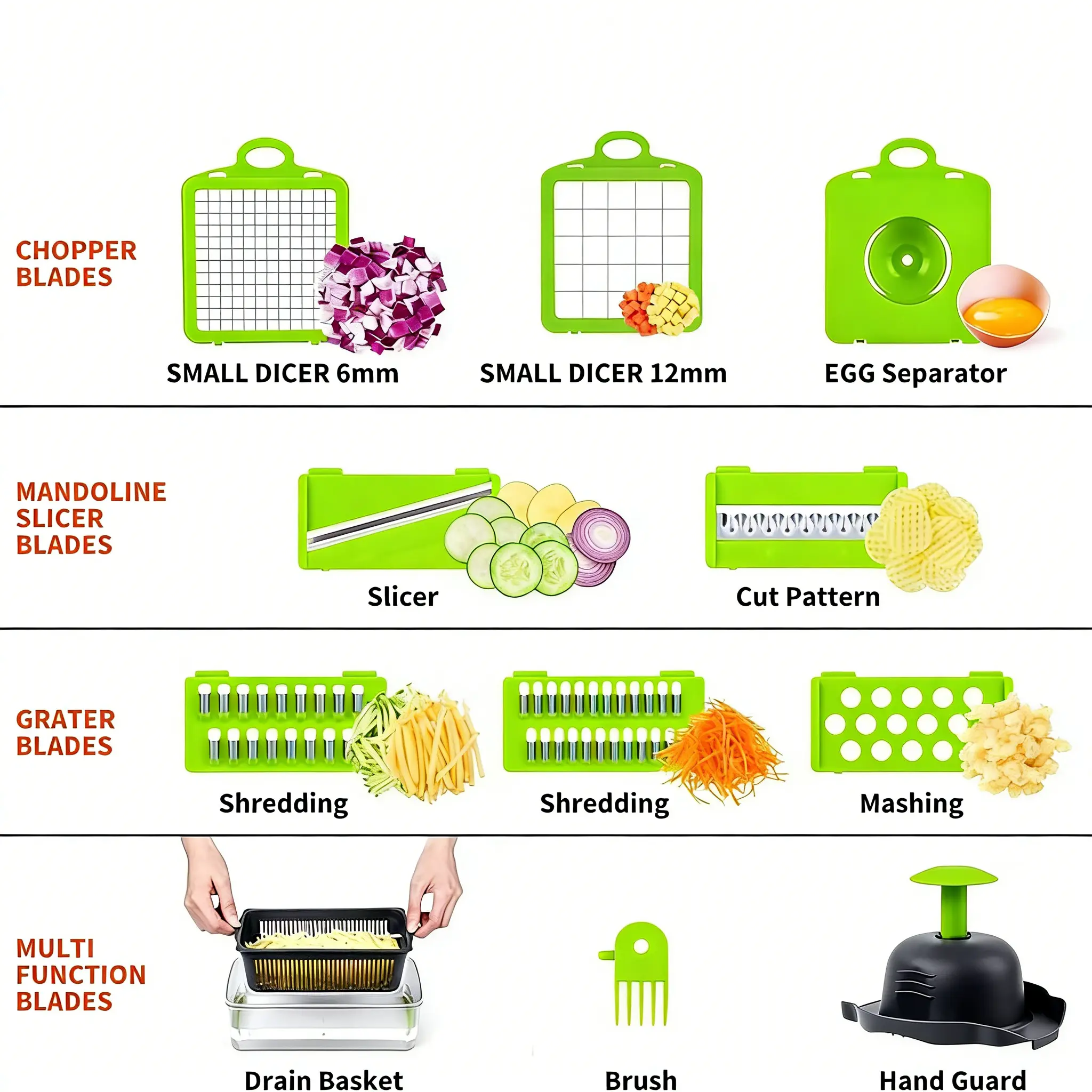 【Multifunctional Use】: This Vegetable Chopper integrates multiple functions, capable of slicing, dicing, and grating a variety of vegetables and fruits.