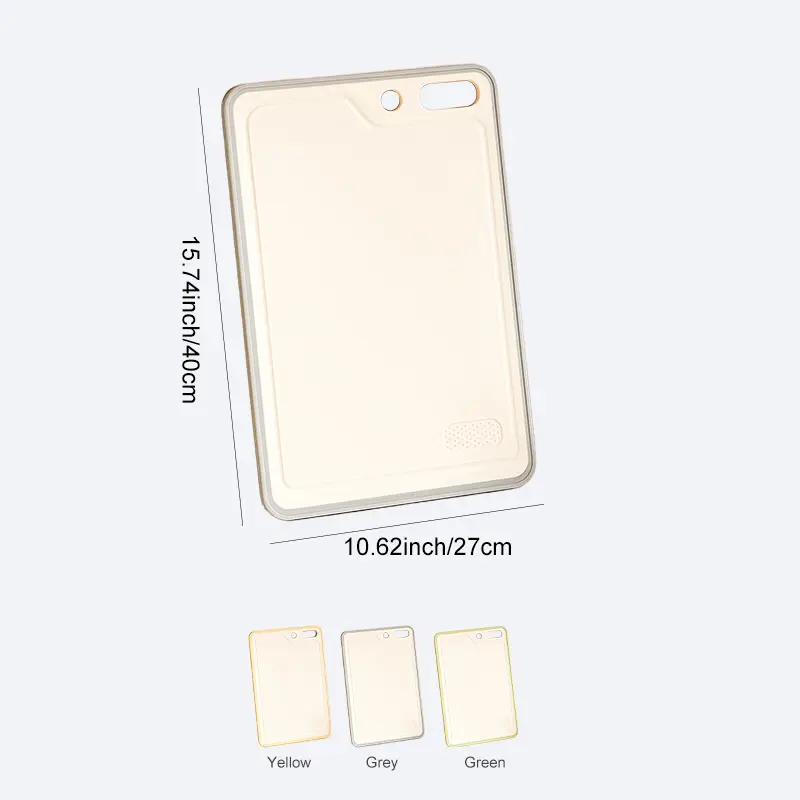 Measures 40cm x 27cm (15.74" x 10.62"). Available in yellow and green, matching various kitchen styles. Enjoy ample working space with this versatile cutting board. Its size provides flexibility for different kitchen tasks.