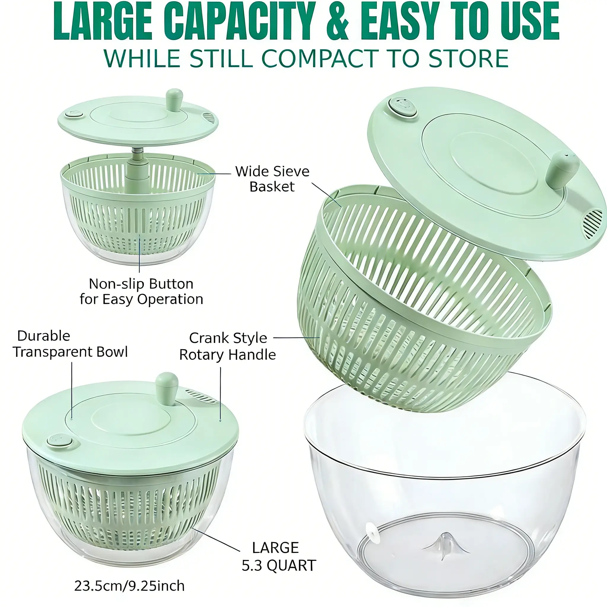 ·3 IN 1 Multifunctional Kitchen Gadget: This salad spinner with strainer and shredding blade can be used for washing, chopping vegetables, leaving foods crisp and 95% drier. It also includes a salad bowl and a clip for mixing salads.5.3L large capacity measures 9.25 x 5.52 inches.