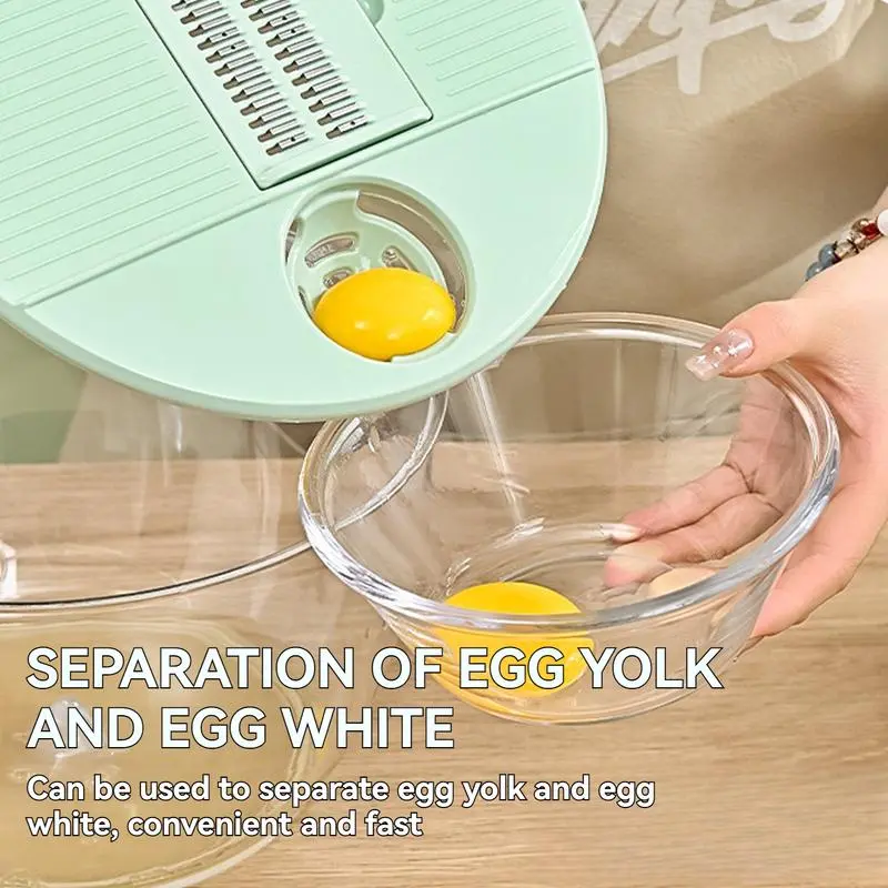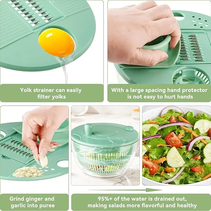 Upgrade Function: This fruit washer spinner bowl features a lid designed to separate egg yolks and a juicer for making juice. The lid of this salad bowl can be used to grate both garlic and ginger, and it comes with a slicer and julienne cutter.