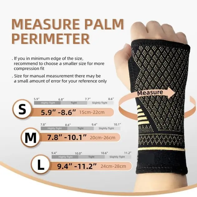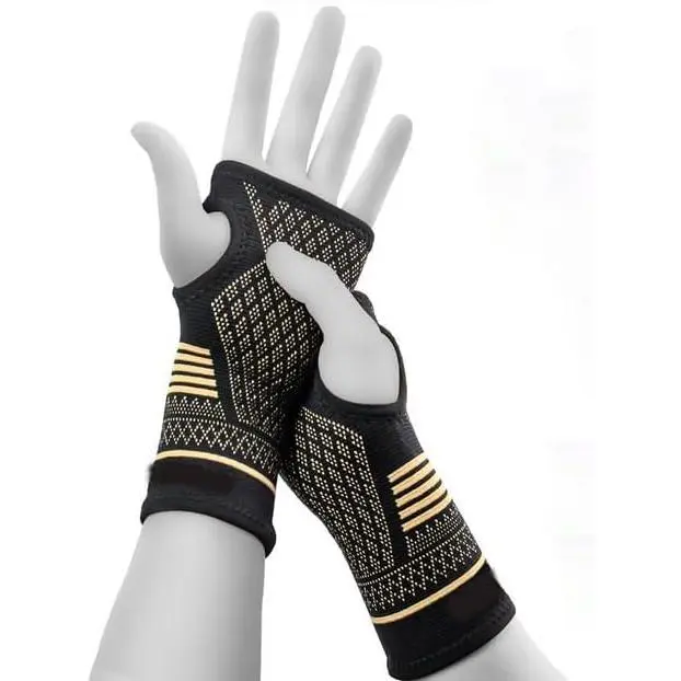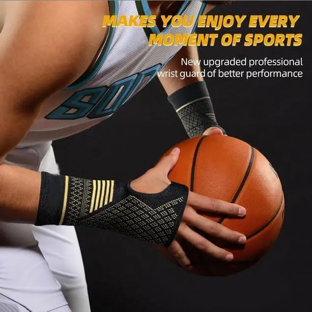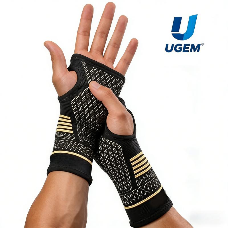 The UGEM Copper Wrist Supports Sleeve is a 2-pack of wrist compression sleeves. These wrist braces are designed for pain relief, arthritis, and carpal tunnel relief. Made from polyester fiber, they are suitable for adults. The sleeves come in black and gold. Perfect for running, cycling, and basketball.
